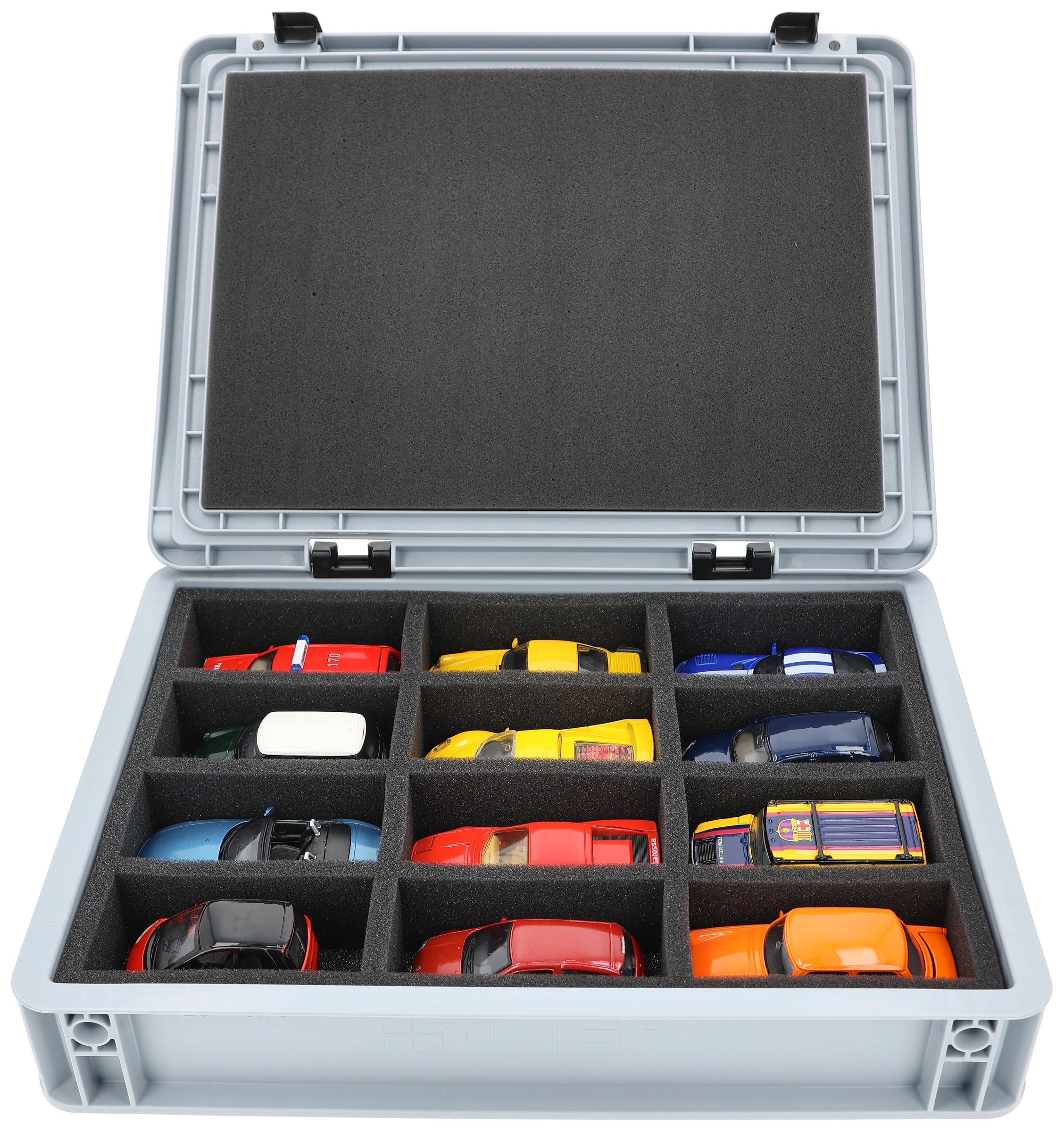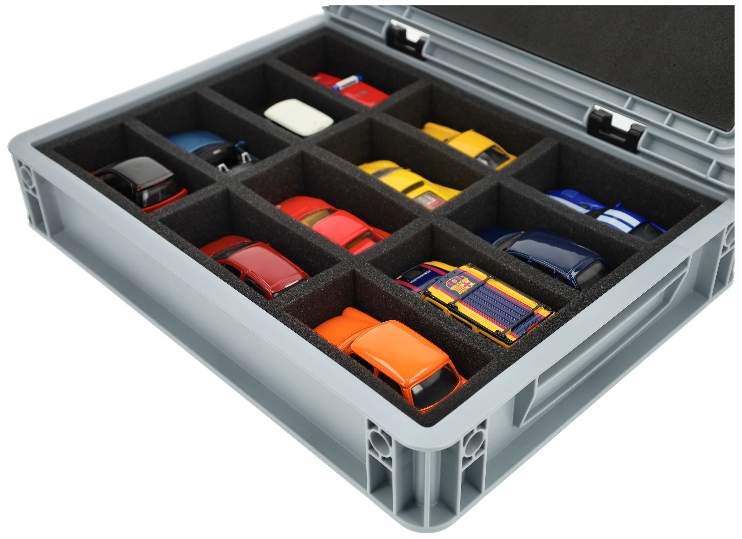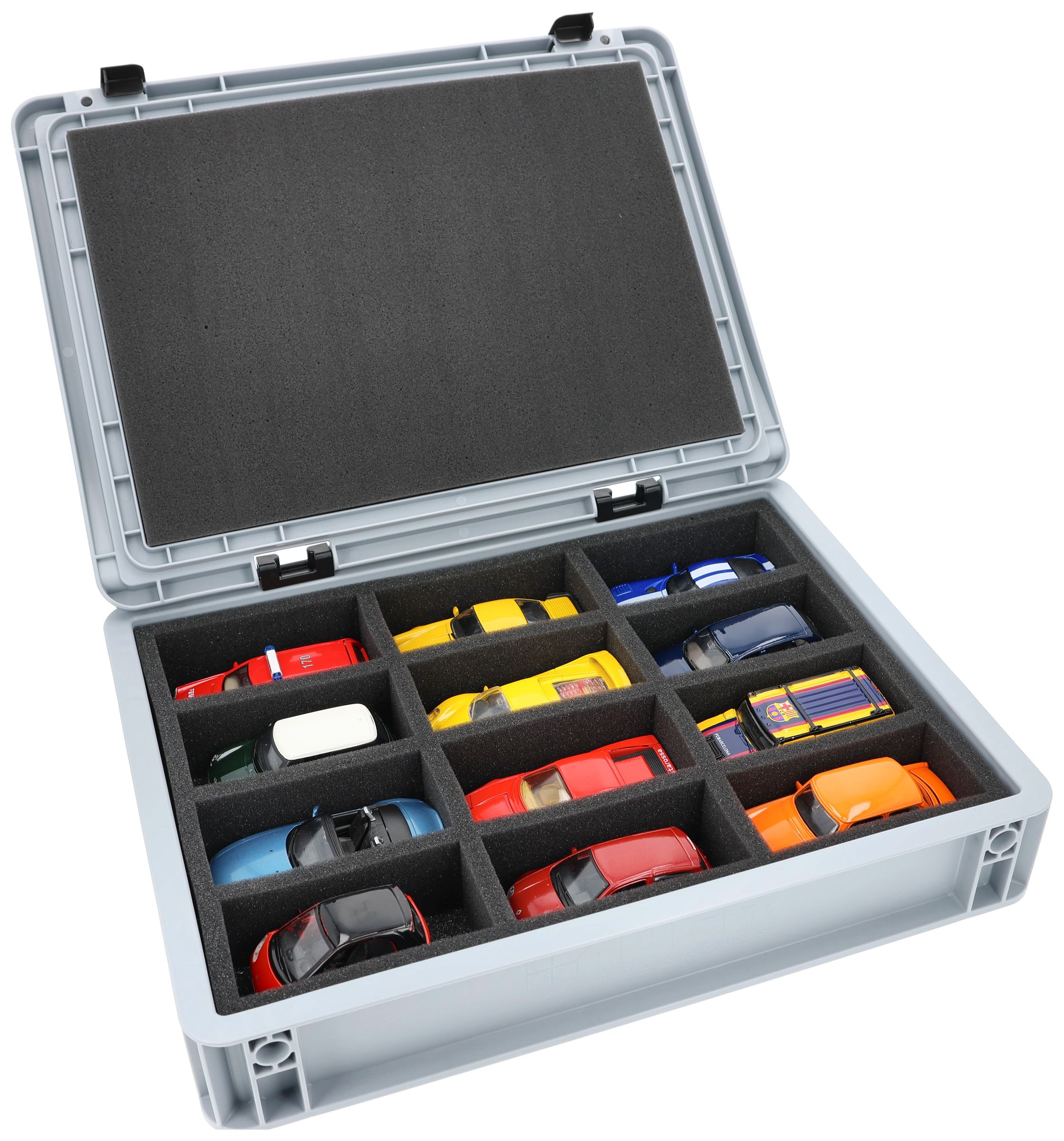 - Precision foam insert with 12 compartments for 1:43 scale vehicles - compartment dimensions approx. 110 x 45 x 45 mm