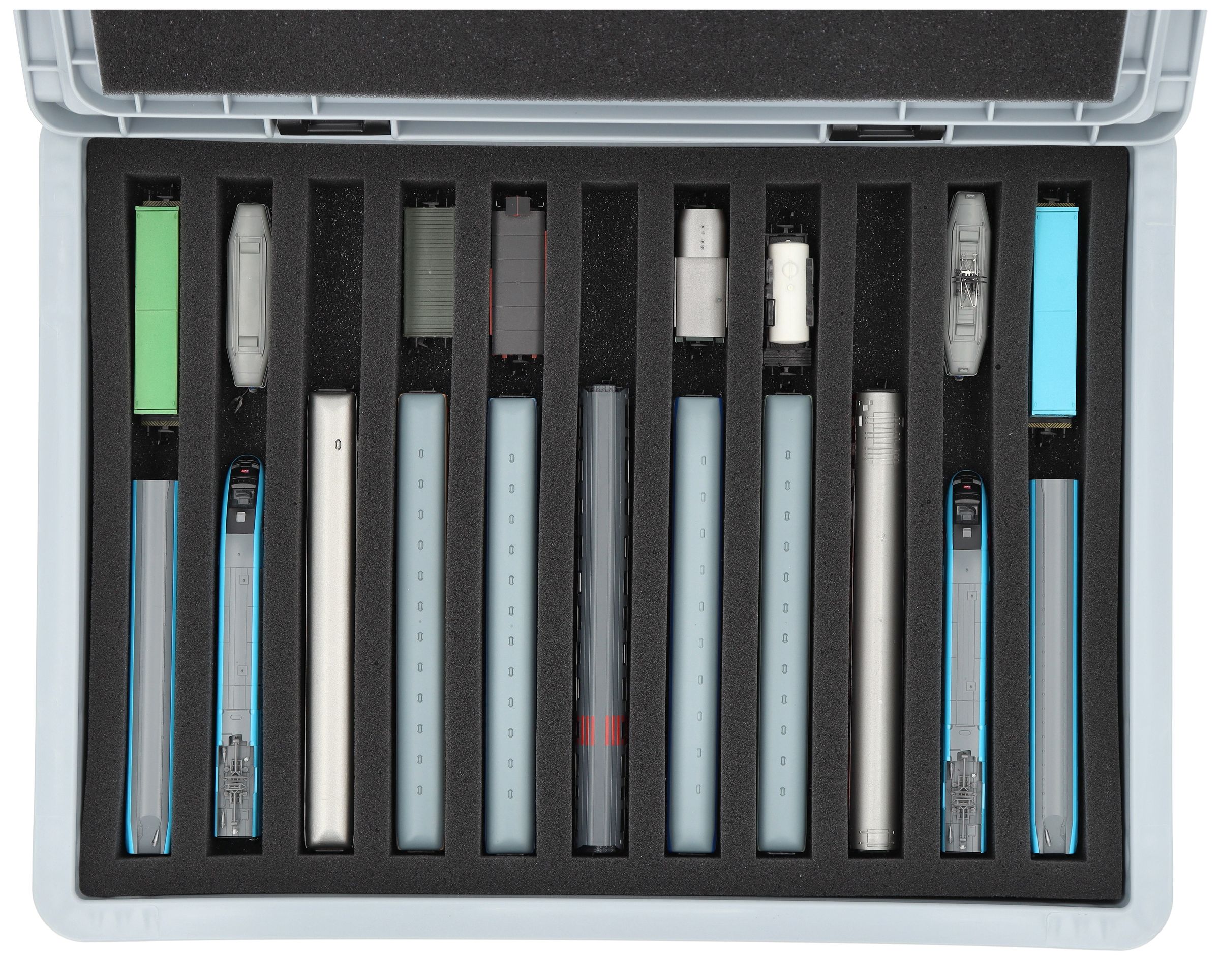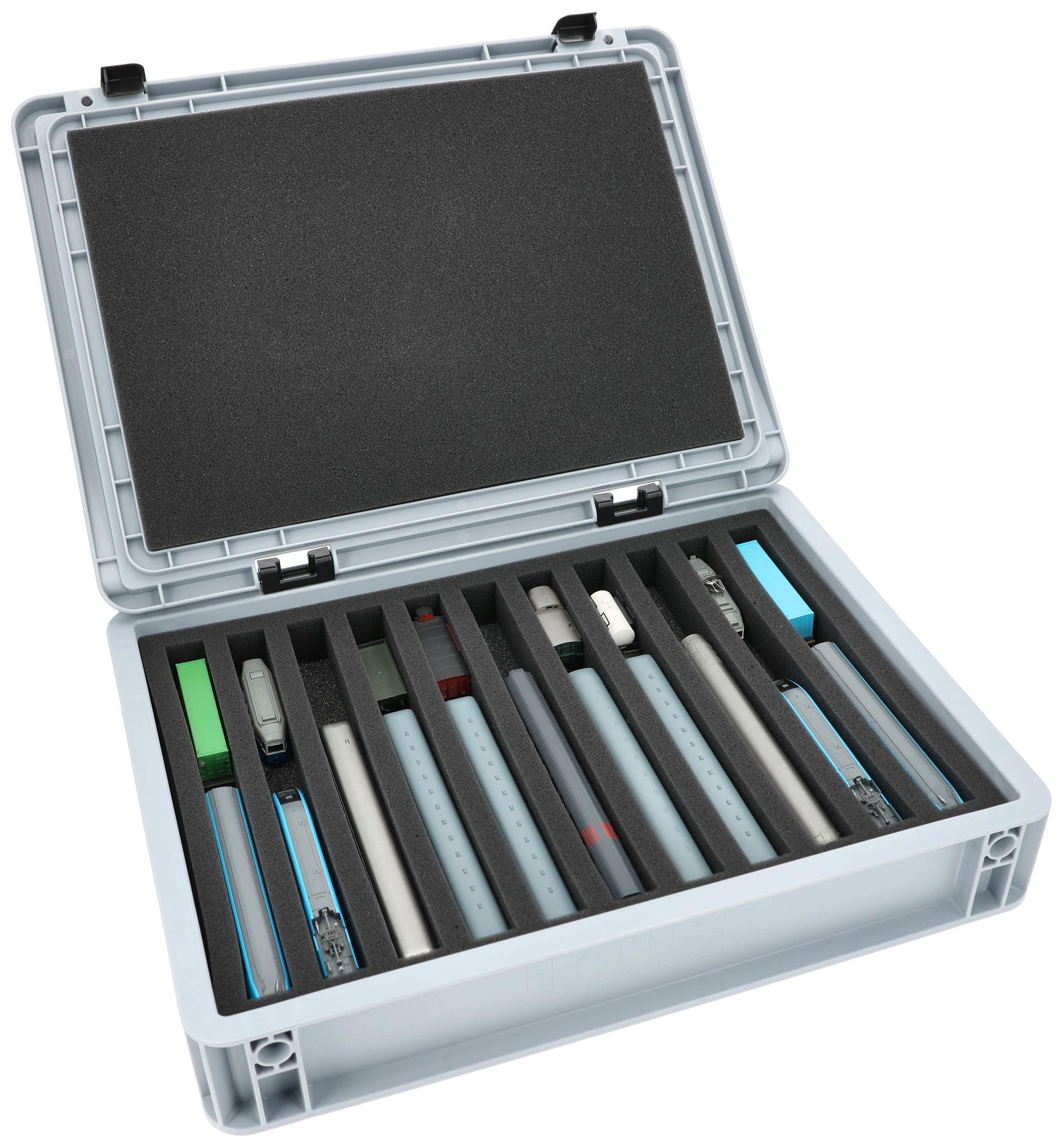 The 11 equal-sized compartments (each approx. 245 x 20 x 30 mm) are specially designed for N scale models. Depending on their length, several wagons or locomotives can be placed side by side. The exact fit ensures that the models are securely fixed and do not slip during transport.