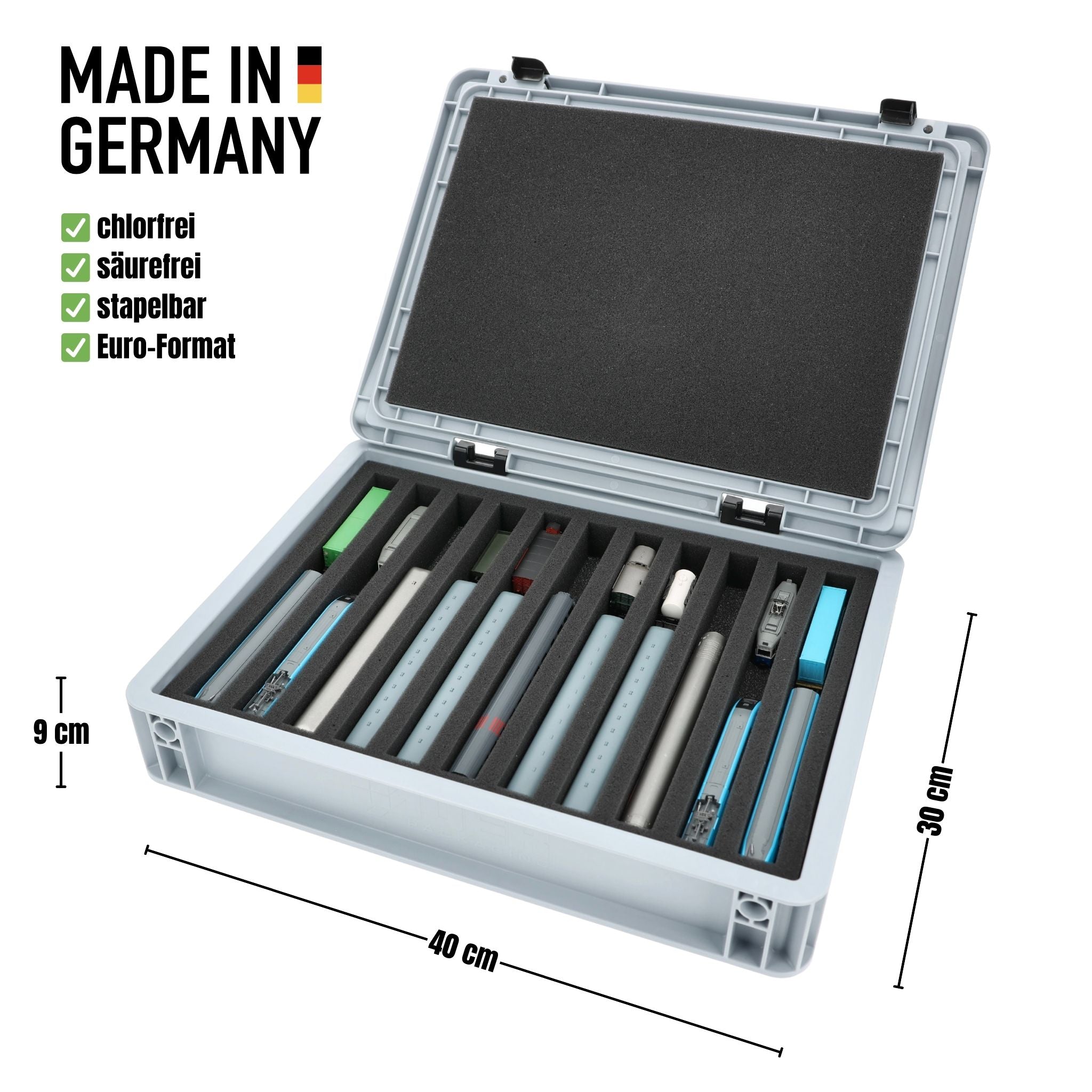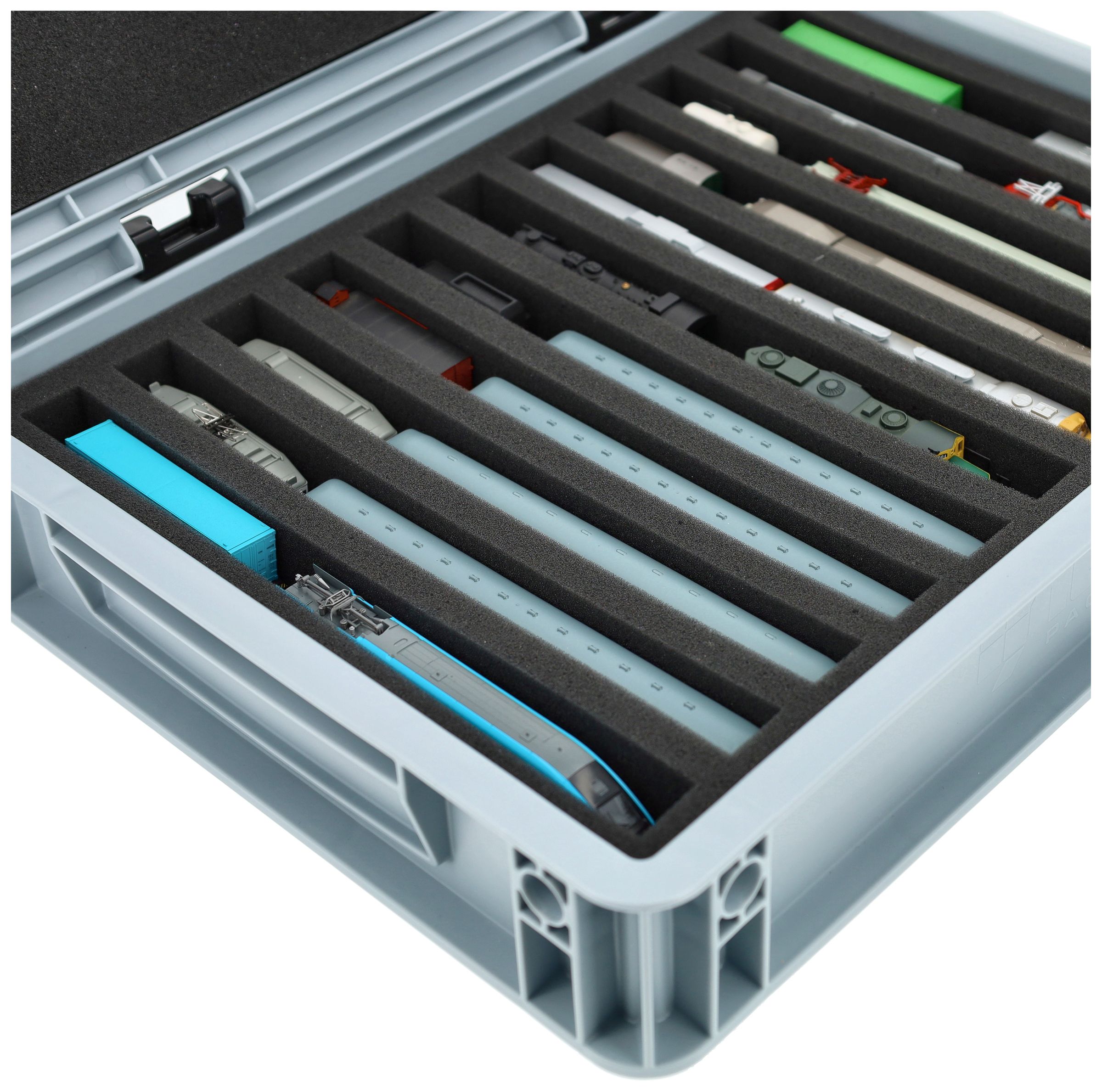 For anyone who wants to transport their N scale locomotives, wagons and vehicles safely and compactly: this Feldherr set combines a stackable Eurobox with a custom-fit foam insert. Whether for trips to the model railroad club, module meetings, or as a space-saving storage solution at home - your models are well protected at all times.