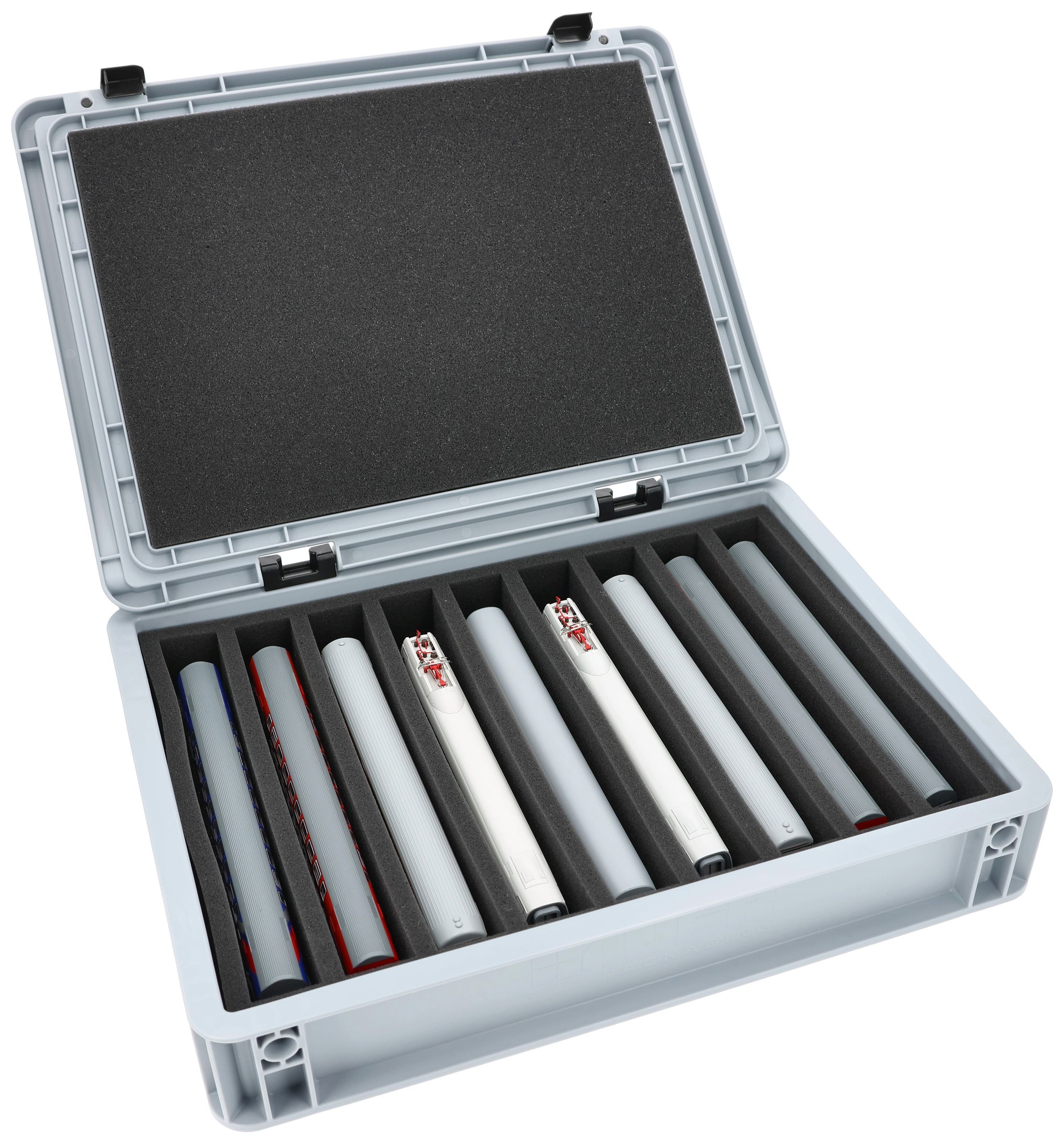 - Schaumstoffeinlage: 370 mm lang x 270 mm breit x 50 mm Gesamthöhe (40 mm Nutzungshöhe + 10 mm Boden)
