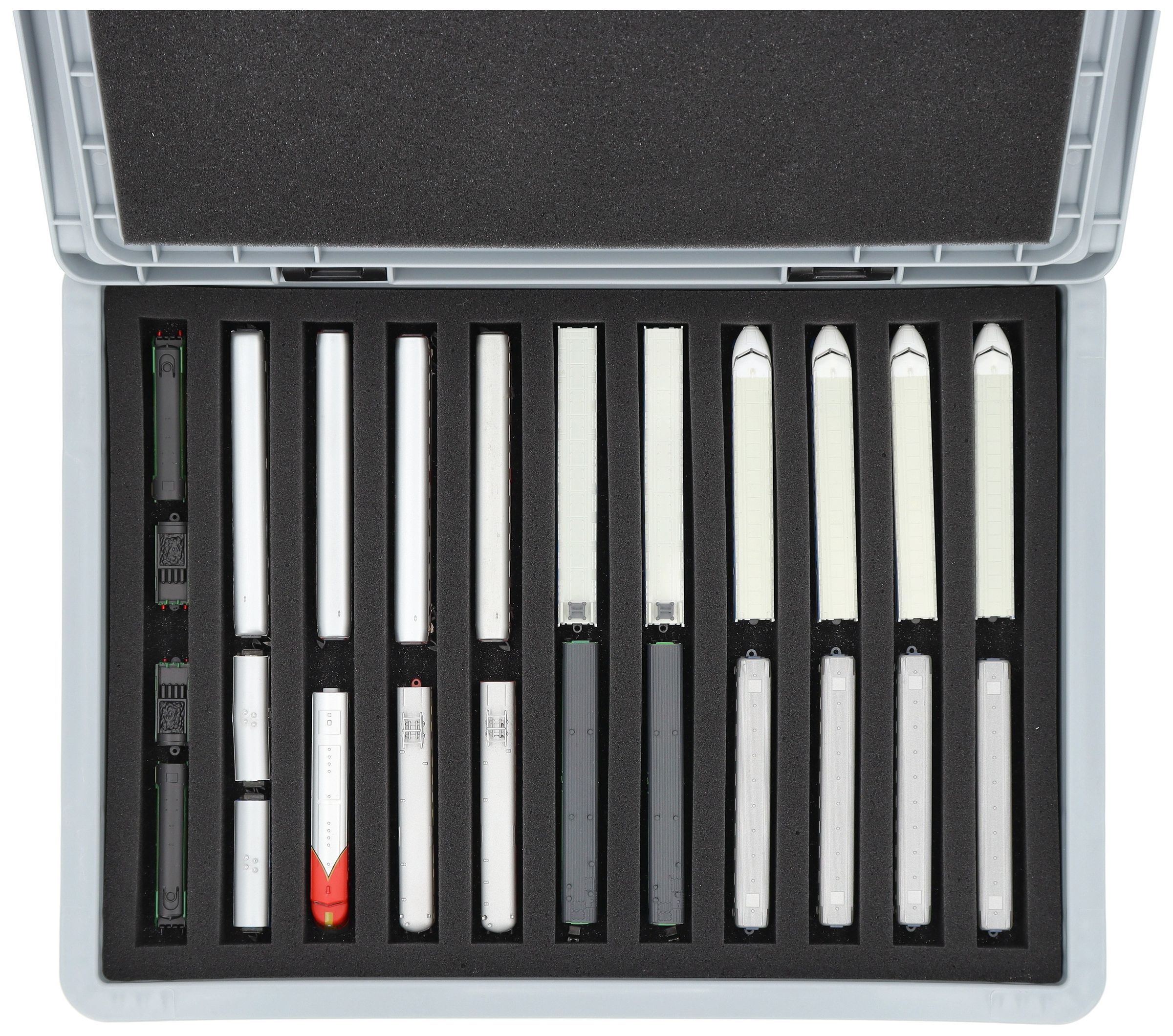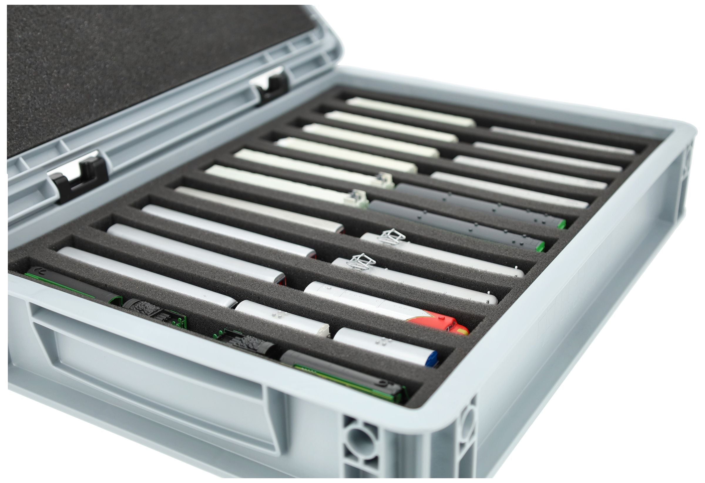 The 11 equal-sized compartments (each approx. 245 x 20 x 20 mm) are specially designed for Z scale models. Depending on their length, several wagons or locomotives can be placed side by side. The exact fit ensures that the models are securely fixed and do not slip during transport.
