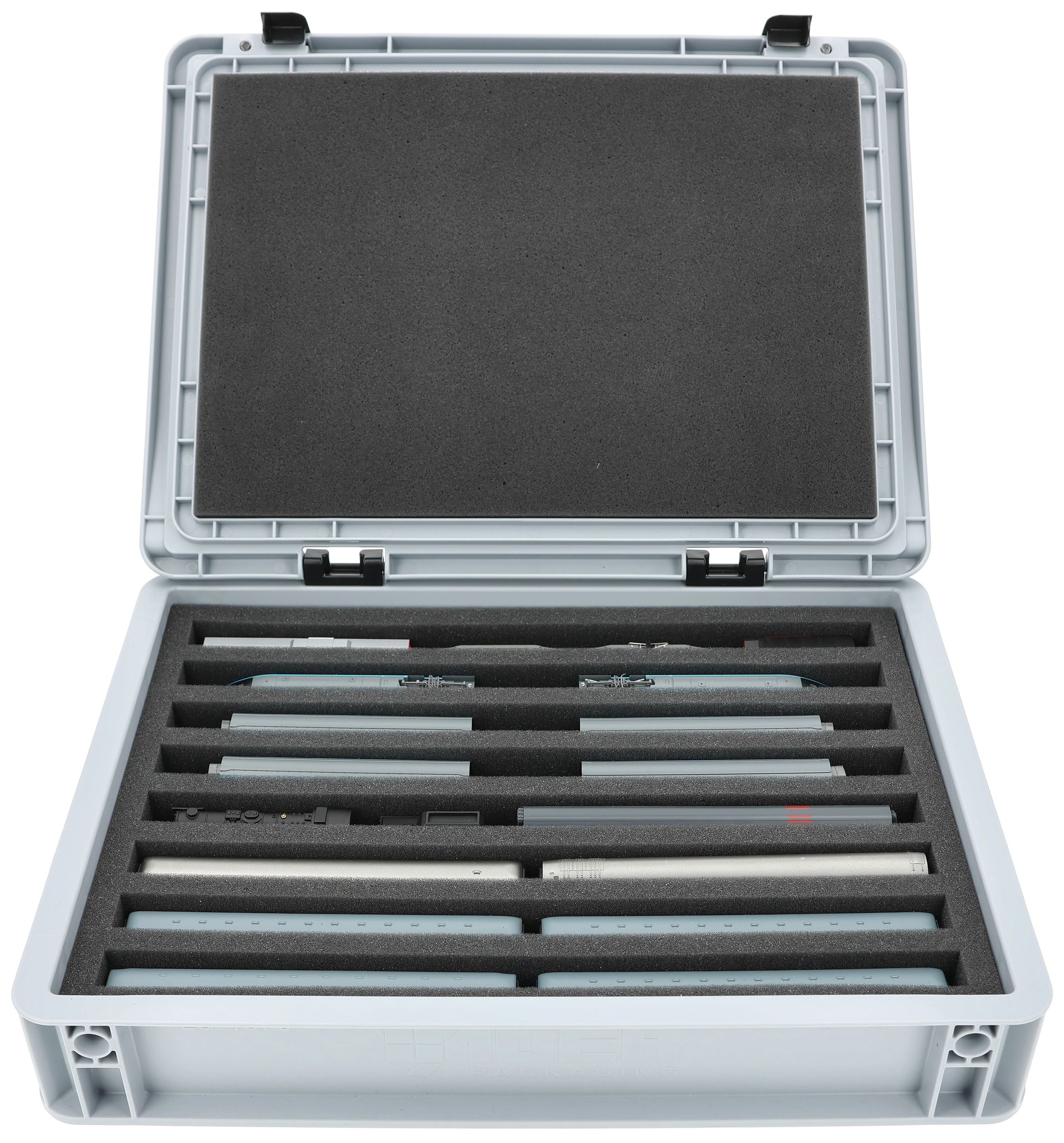 The fine-pored foam reliably protects sensitive details, paintwork, and attachments on your models from scratches and damage. The sturdy Eurobox made of shock-resistant plastic provides additional protection from external influences. A simple hinge system with two locks keeps the box securely closed and protects the contents from dust and dirt.