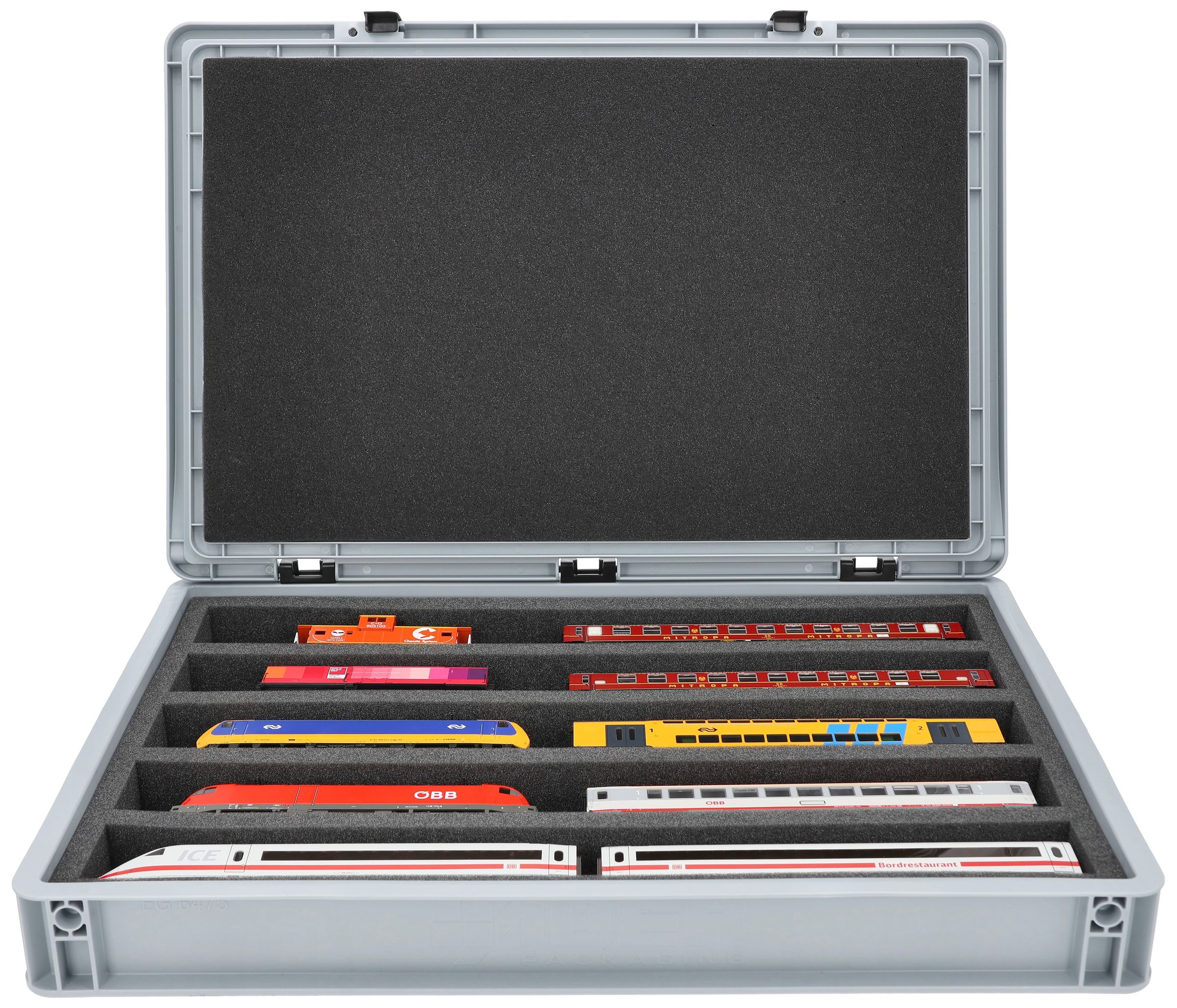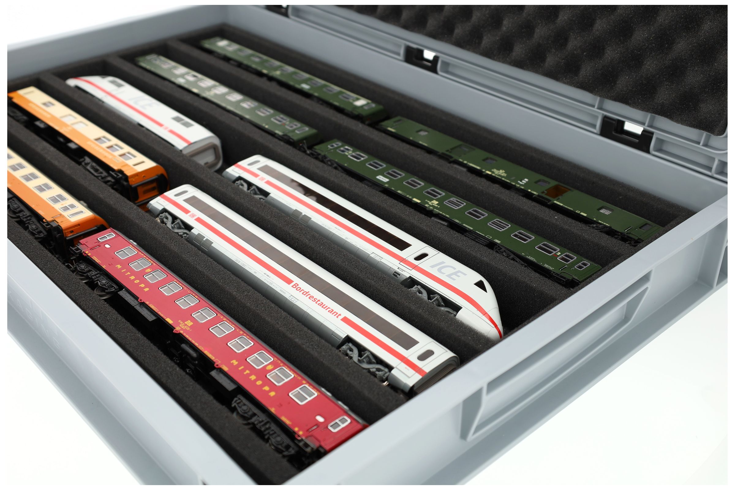 The 5 equal-sized compartments (each approx. 550 x 55 x 40 mm) are specially designed for H0 scale models. Thanks to the long compartments, locomotives and wagons can be placed side by side. The exact fit ensures that the models are securely fixed and do not slip during transport.