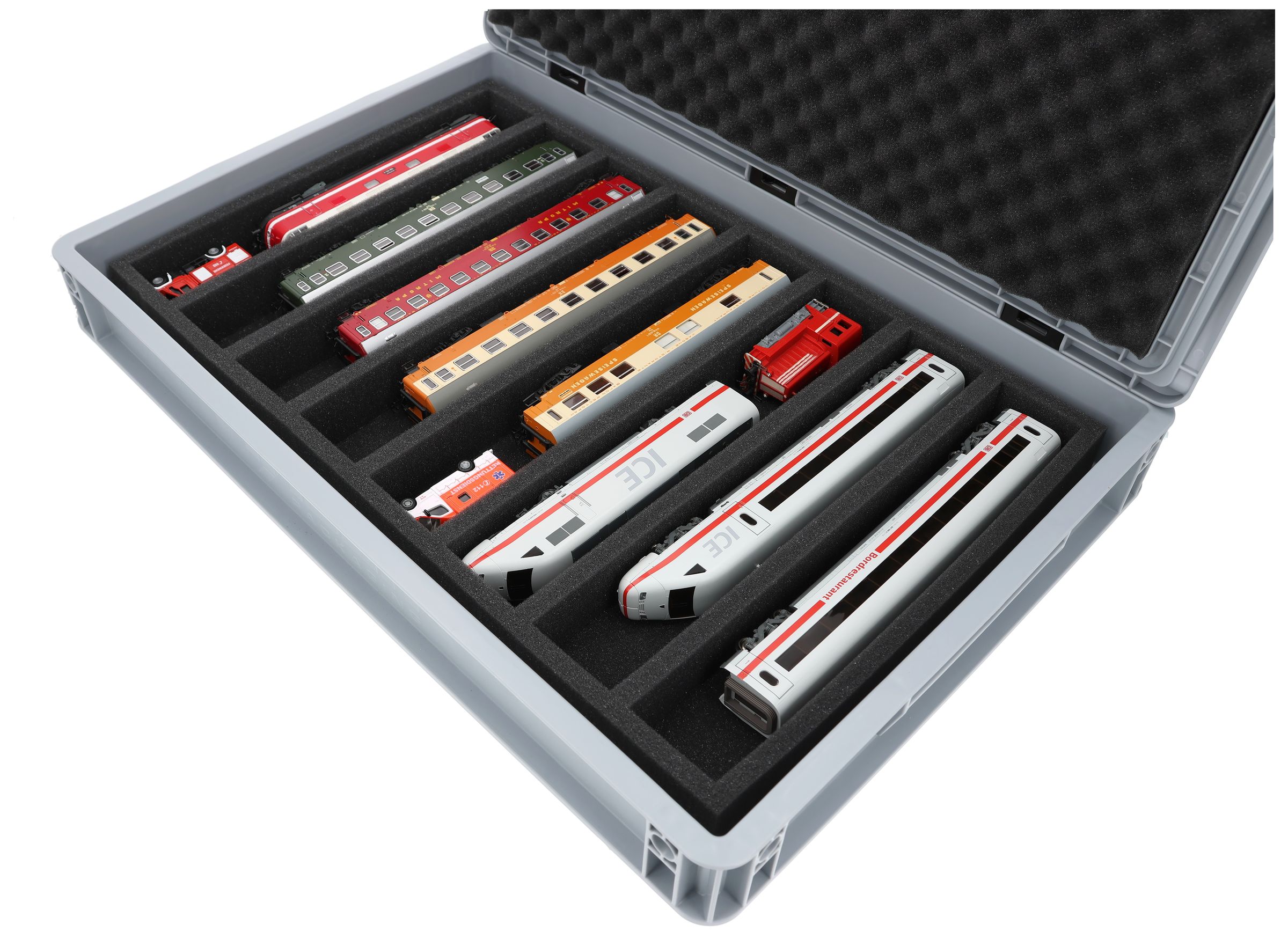 The 8 equal-sized compartments (each approx. 320 x 55 x 40 mm) are specially designed for H0 scale models. Depending on their length, locomotives and wagons can be placed side by side. The exact fit ensures that the models are securely fixed and do not slip during transport.