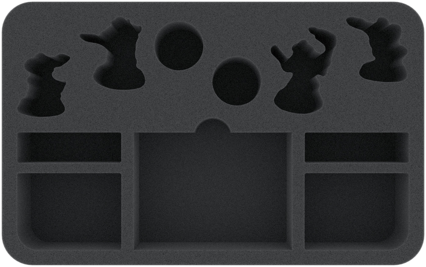 The four warriors of your Warband and both dogs get here miniature-precisely cut compartments assigned. The miniatures are, thus, safely embedded in soft foam, best prepared for transport to the tabletop. Axes, torches, and all other sensitive details thus remain intact and ready for use at any time.