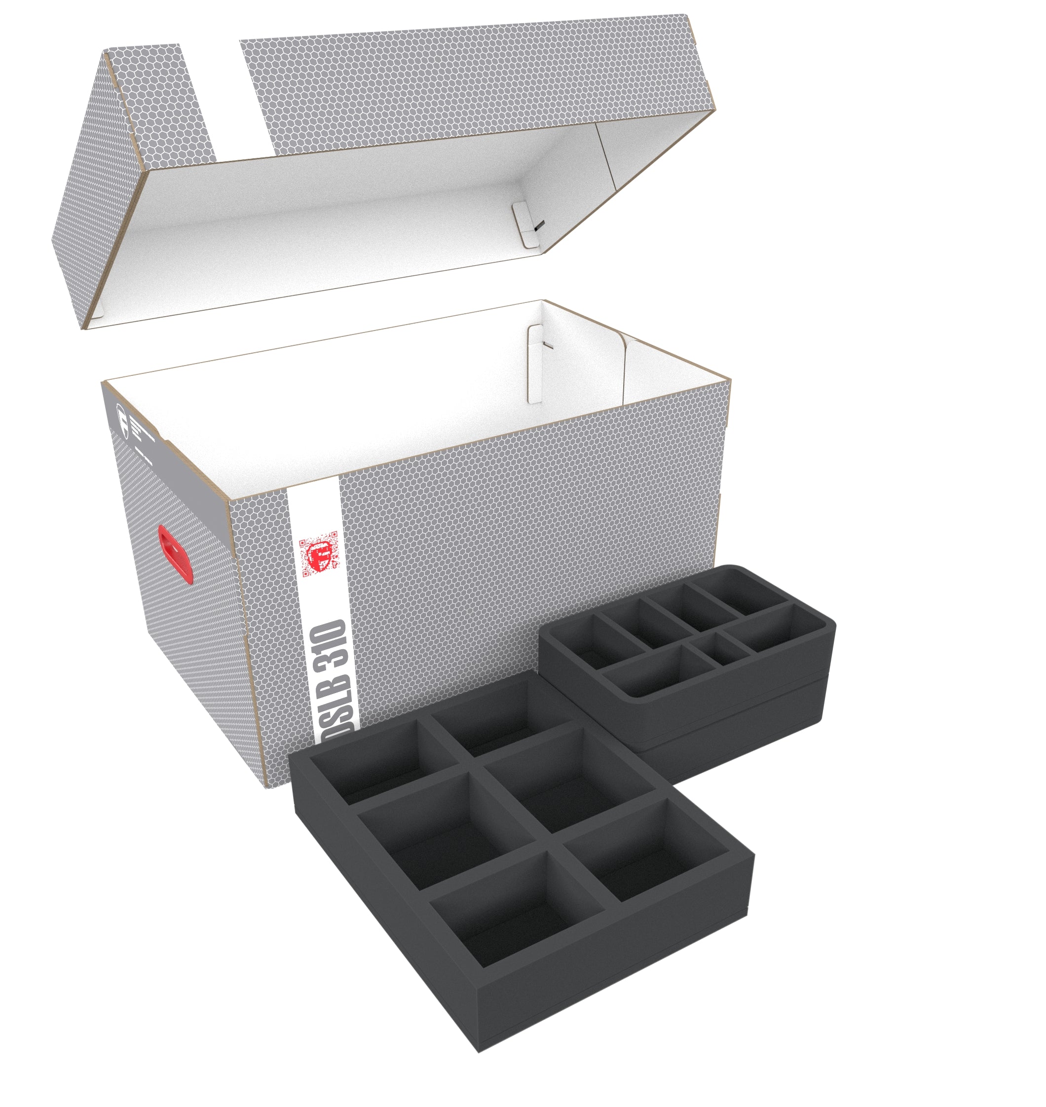 The Storage Box DSLB310 is made of coated, corrugated cardboard. This makes it not only pleasantly light but also very tear-resistant and stable. The attachable lid reliably protects the contents from dust and other external influences. With the appropriate foam trays, miniatures, game material, and all other goods can be stored safely — and conveniently transported with the two plastic-reinforced carrying handles on the sides.