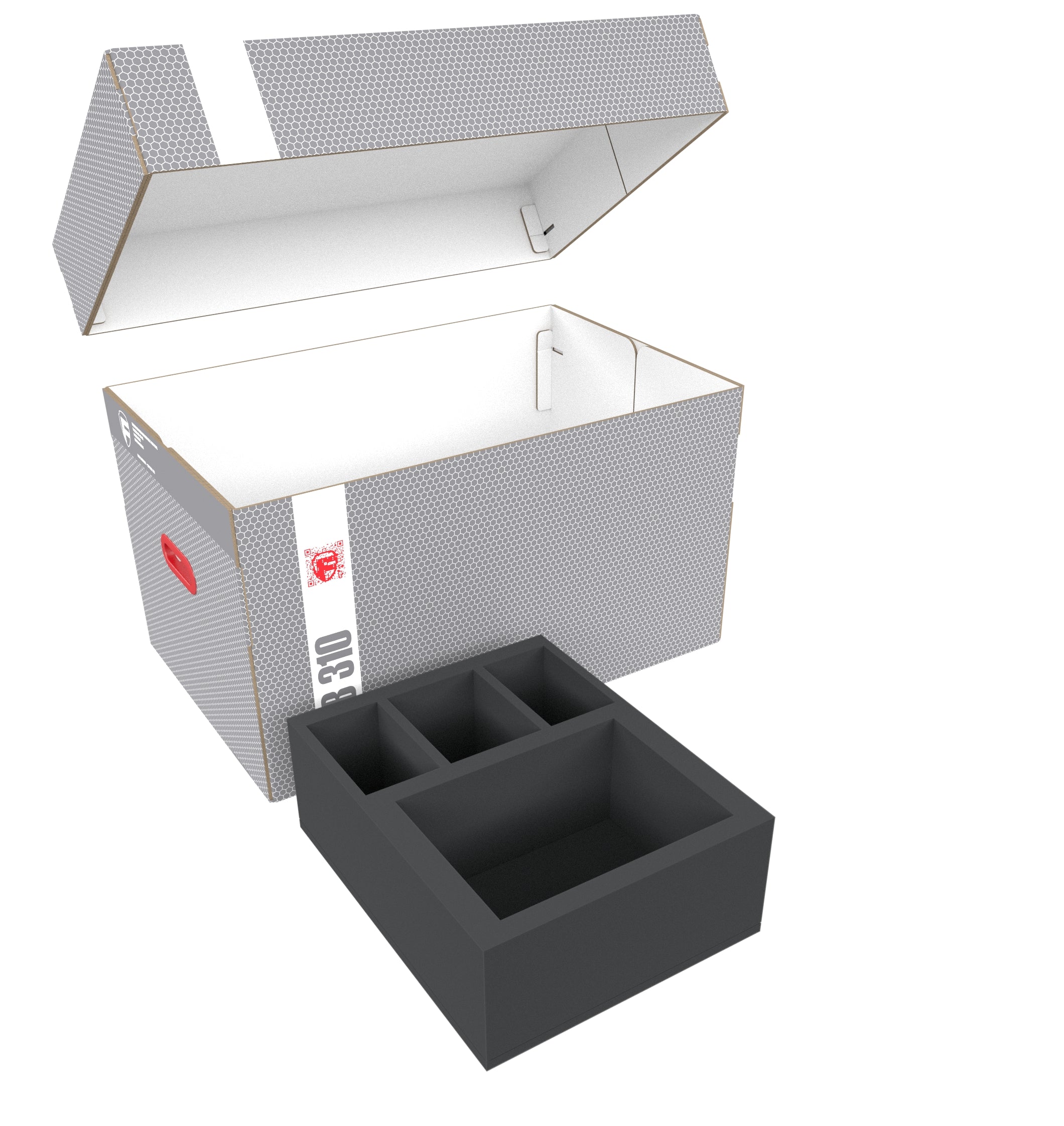 The Storage Box DSLB310 is made of coated, corrugated cardboard. This makes it not only pleasantly light, but also very tear-resistant and stable. The attachable lid reliably protects the contents from dust and other external influences. With the appropriate foam trays, miniatures, game material, and all other goods can be stored safely — and conveniently transported with the two plastic-reinforced carrying handles on the sides.