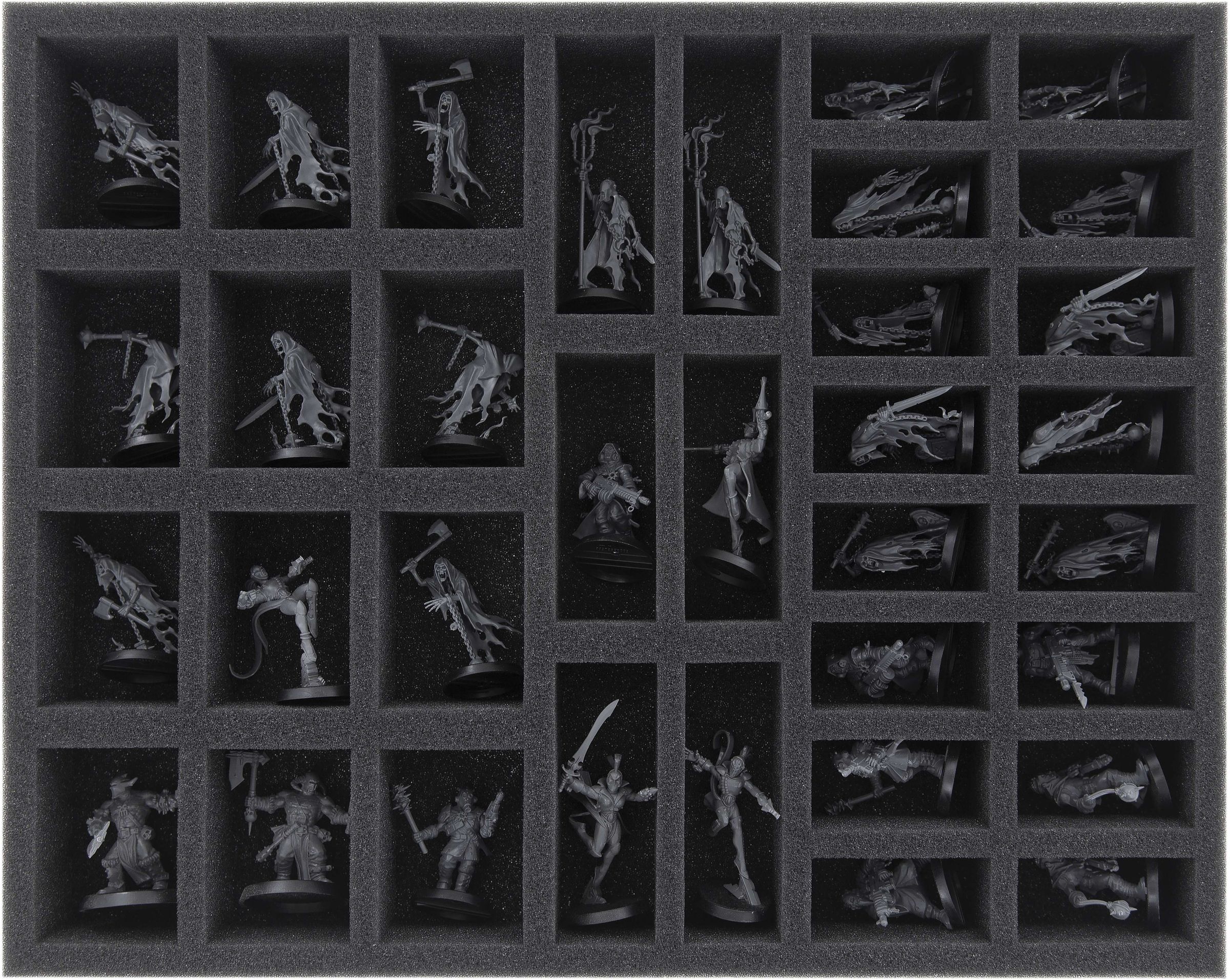 The foam tray has 34 compartments which will hold miniatures of different sizes. The fine-pored foam reliably protects your figures – fragile parts remain intact, the color of painted models remains unharmed.