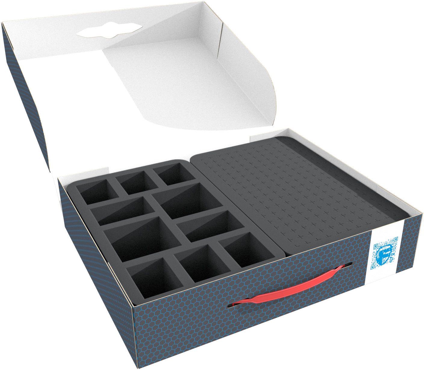 For the survivor dashboards and the game material, we provided you with a self-adhesive Half-Size Pick and Pluck foam tray (including foam base). The pre-cut 14 mm x 14 mm grid makes it easy for you to design the compartments according to your needs. The mat is provided with a self-adhesive underside. After removing the foam segments, peel off the foil and stick it to the supplied foam base. Ready is your individual insert.