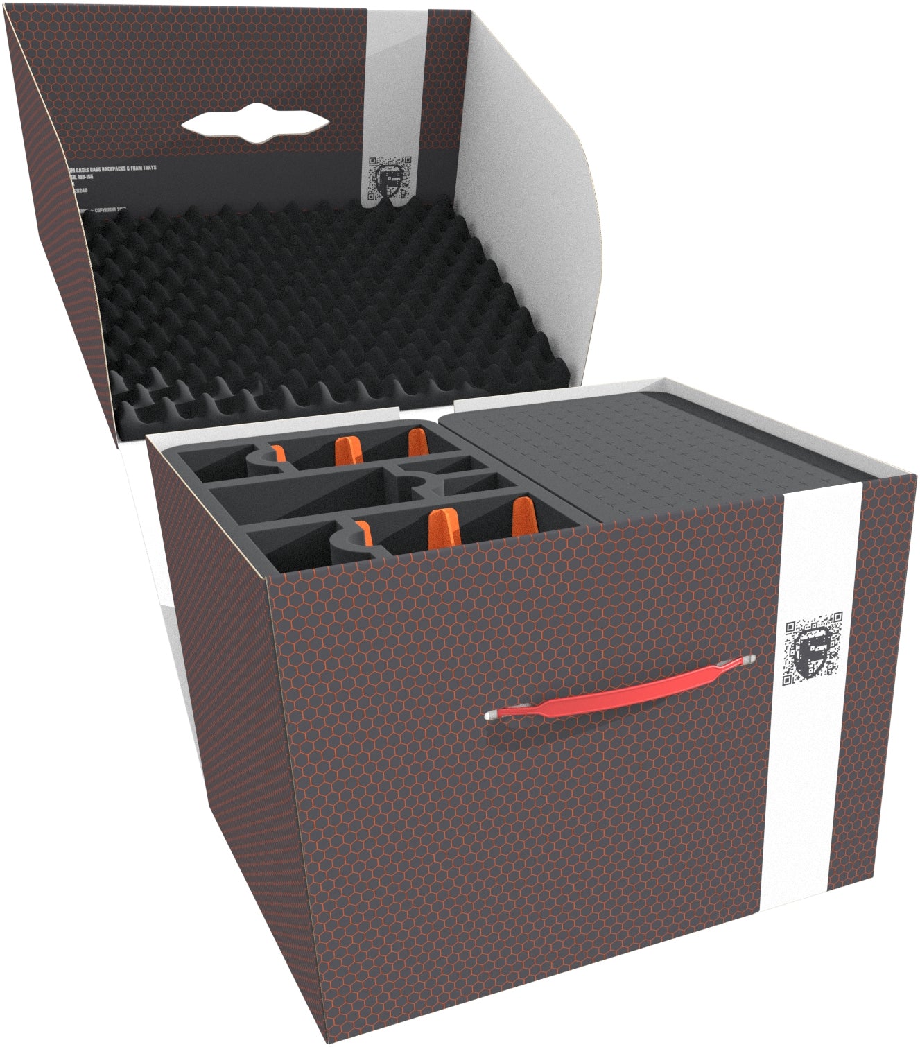 The Storage Box FSLB250 is made of coated, double-walled cardboard. This makes it not only pleasantly light but also particularly tear-resistant and stable. With the matching foam trays, miniatures and game material can be stored safely and dust-protected and can also be transported effortlessly with the plastic carrying handle.