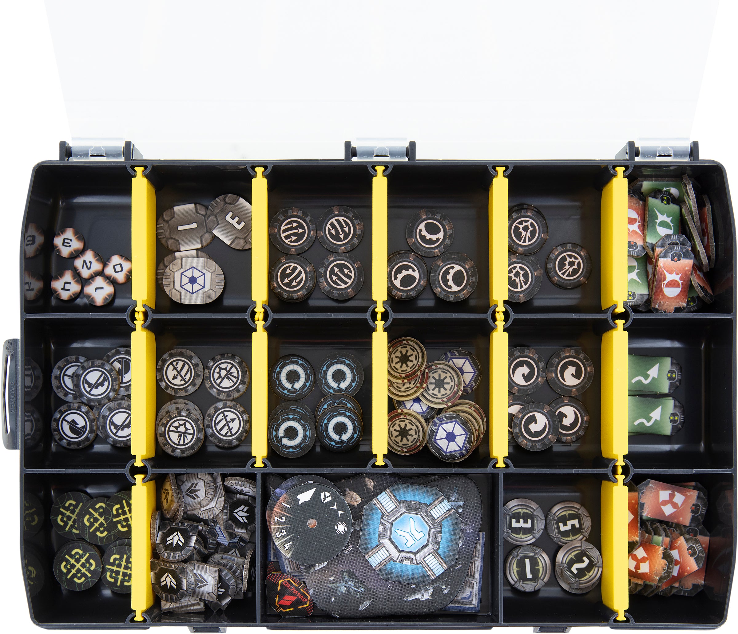 In addition, there is a large compartment for the ship's bases. Here you can also place the fin. The ship tokens can be stored here as well. You can use the two round and four narrow compartments to stow command and speed dials, just like other accessories.