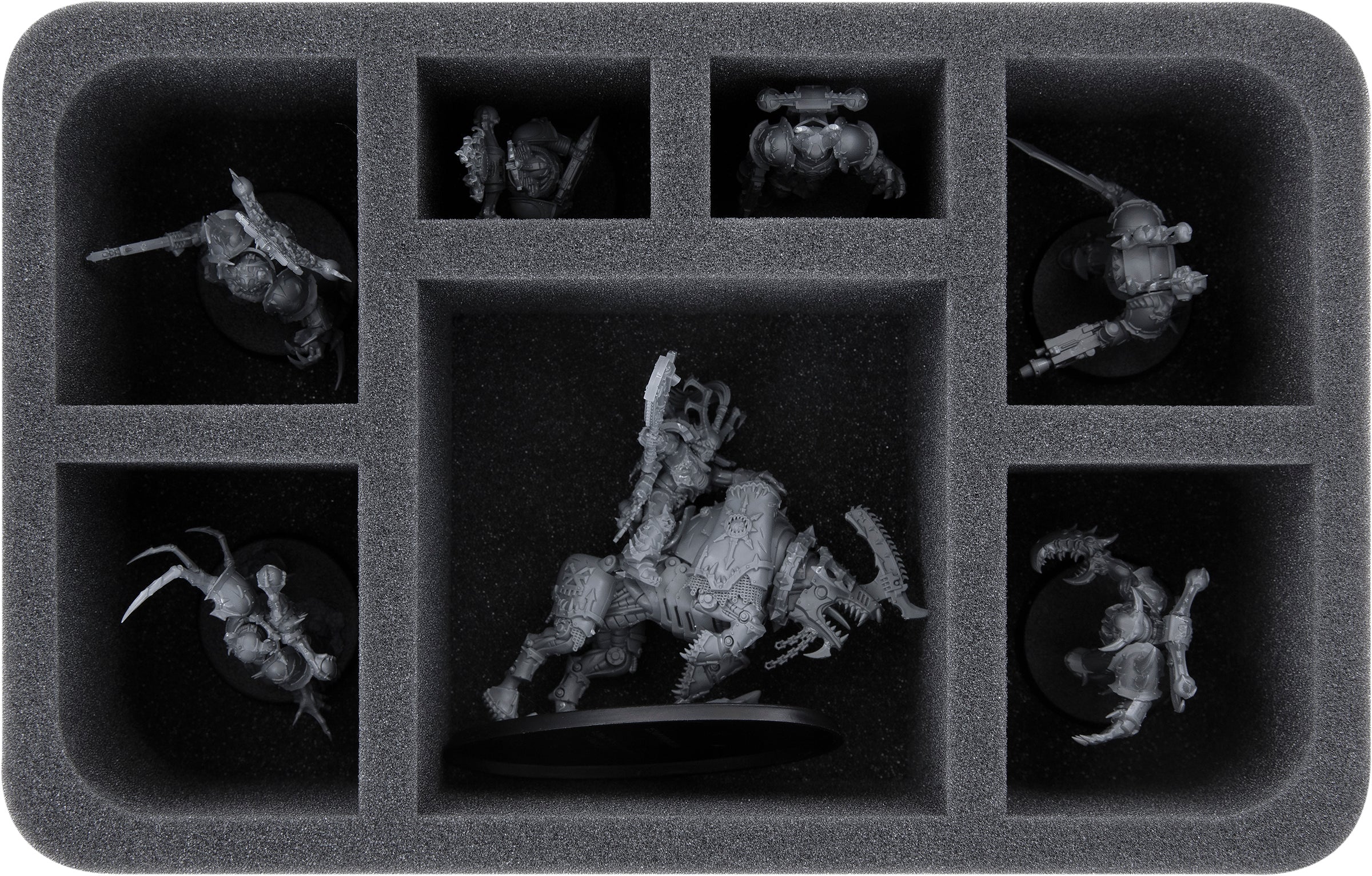 • 1 Half-Size foam tray with seven compartments for sprawling units like Lord Invocatus, Khorne Berserker Standard Bearer, Great Disgraced the Jackal, or models with similar dimensions (HS080A022)