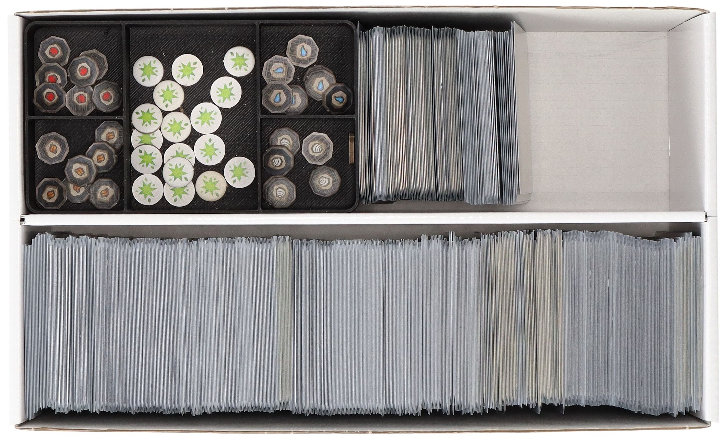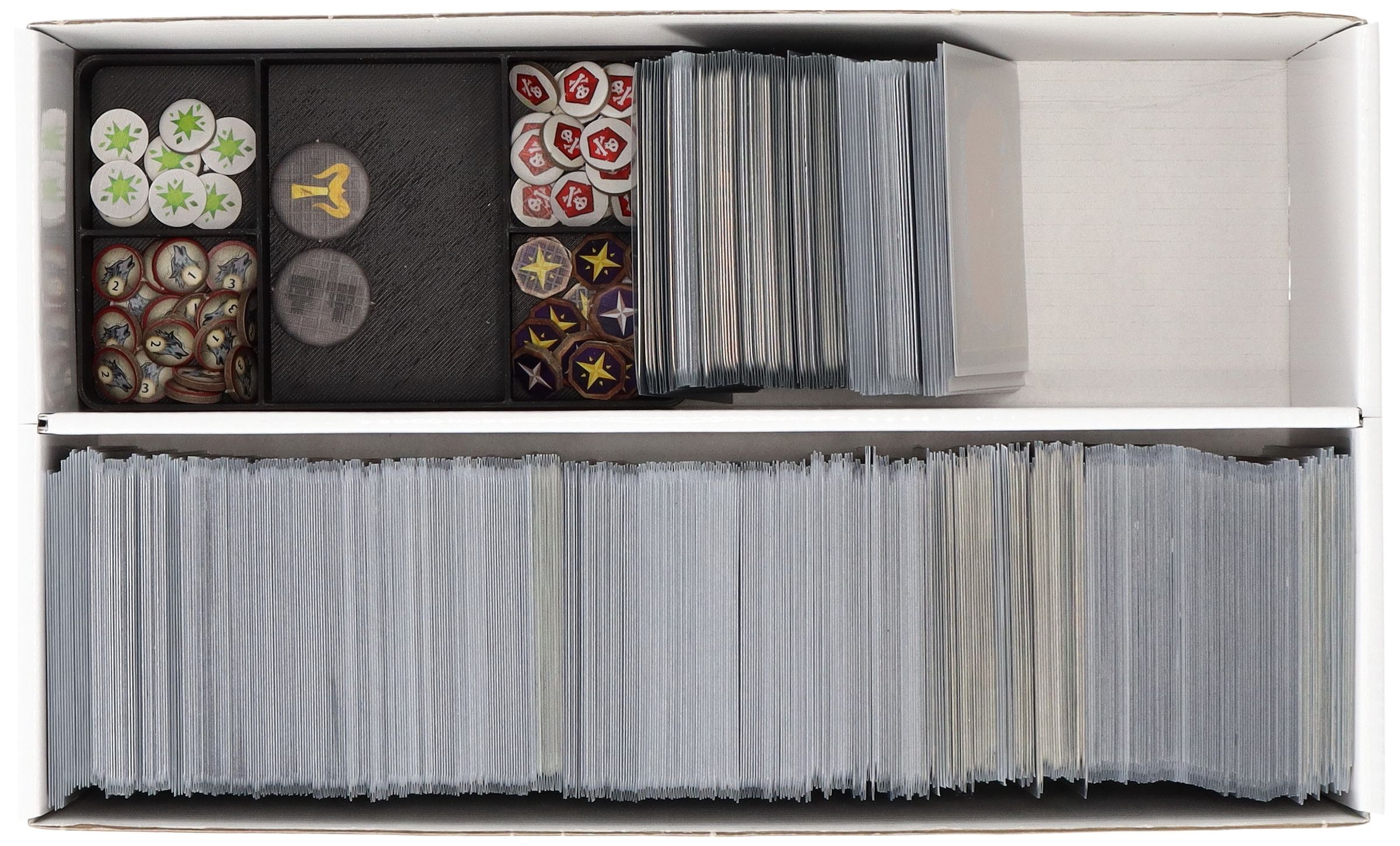 A partition in the middle of the box divides it into two equally sized compartments. This allows the cards to be neatly arranged without mixing during transport.