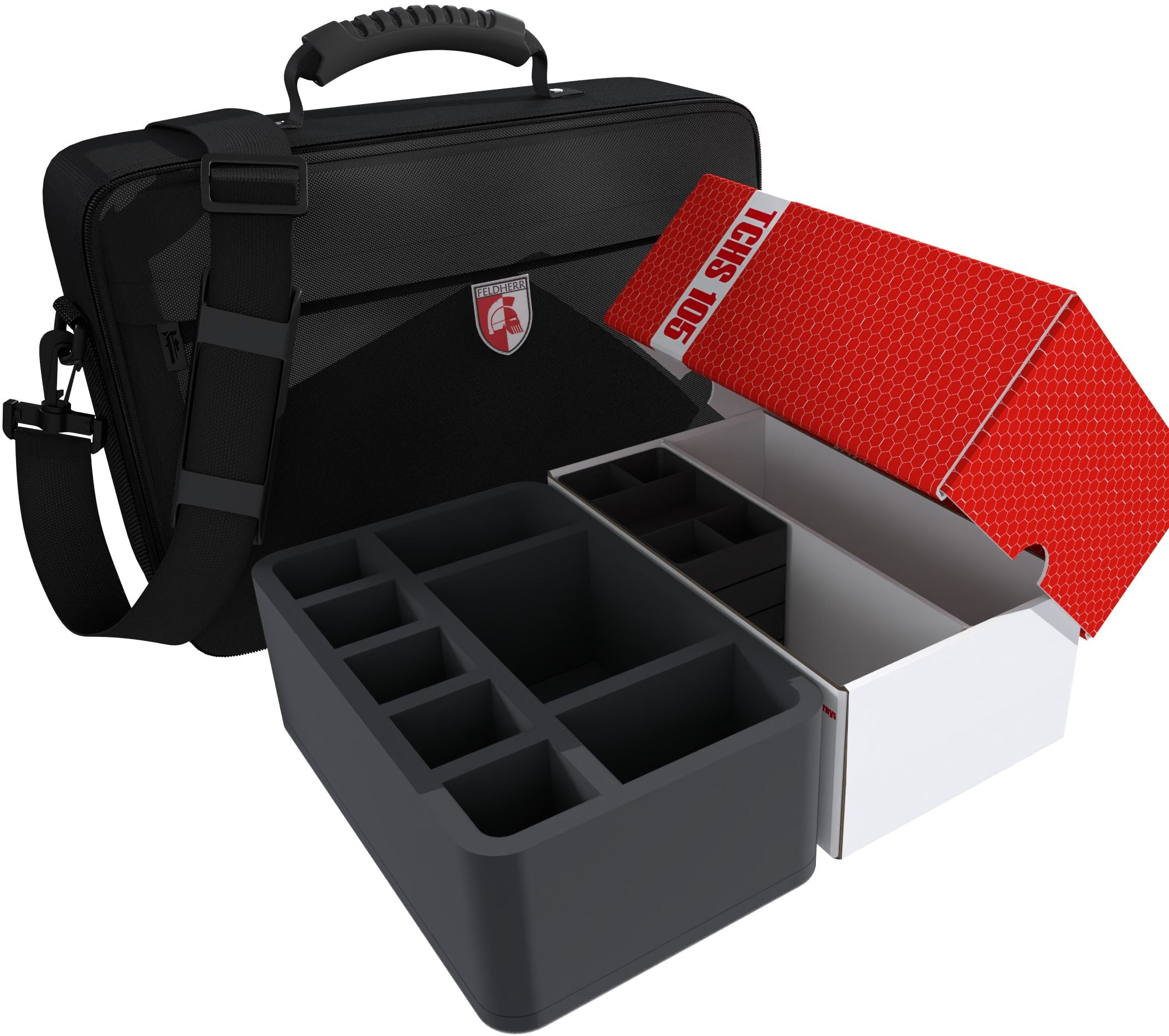 To prevent you from shattering your miniatures because of the thrill, we provide you with the matching Feldherr transport solution. Whether heading to a game night with friends or traveling to distant lands, your expansions are securely stored in the Medium bag with Storage Box TCHS105, plastic Organizer inserts, and Feldherr foam trays. So, you're ready for action-packed adventures!