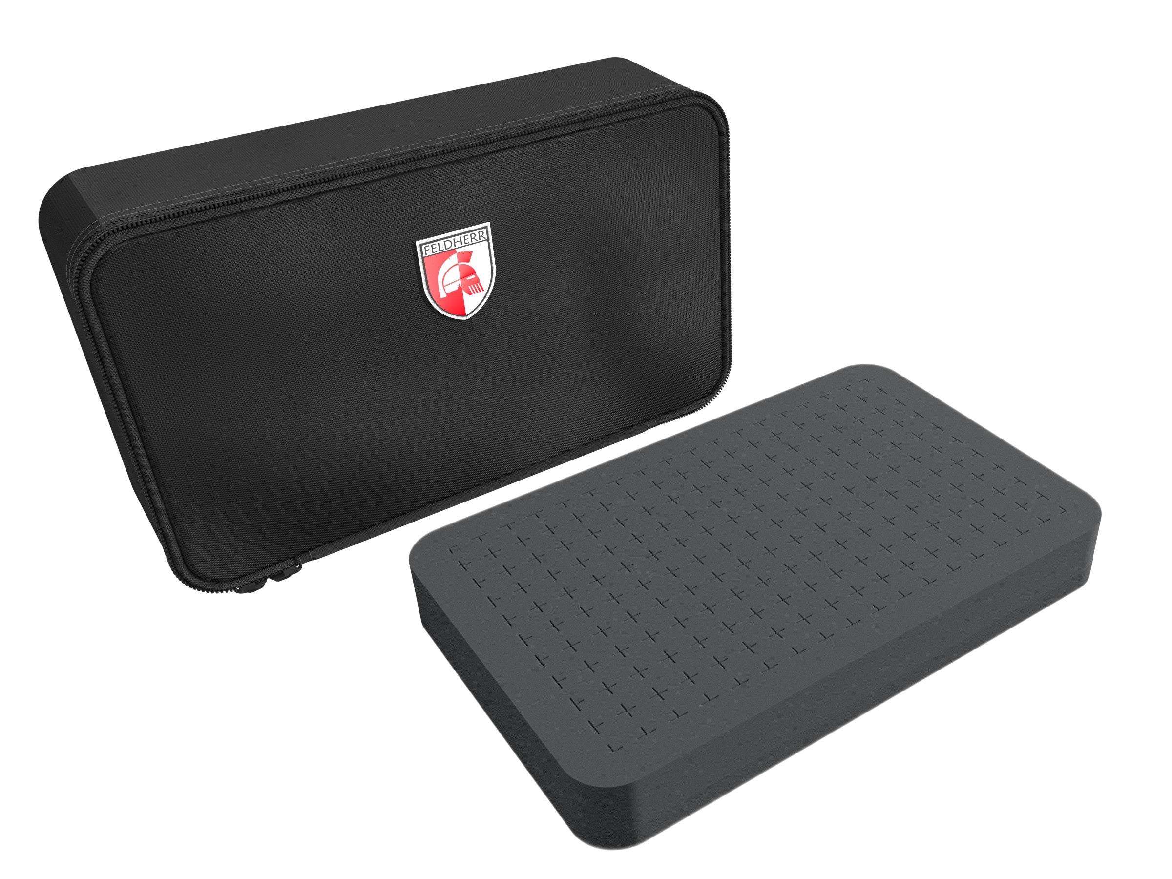 La MINI Case Feldherr se entrega con una bandeja de espuma estándar de 35 mm y una bandeja de espuma de 25 mm. Así, el MINI Case puede acomodar hasta 16 miniaturas estándar y formas personalizadas en la bandeja de espuma de plumón.