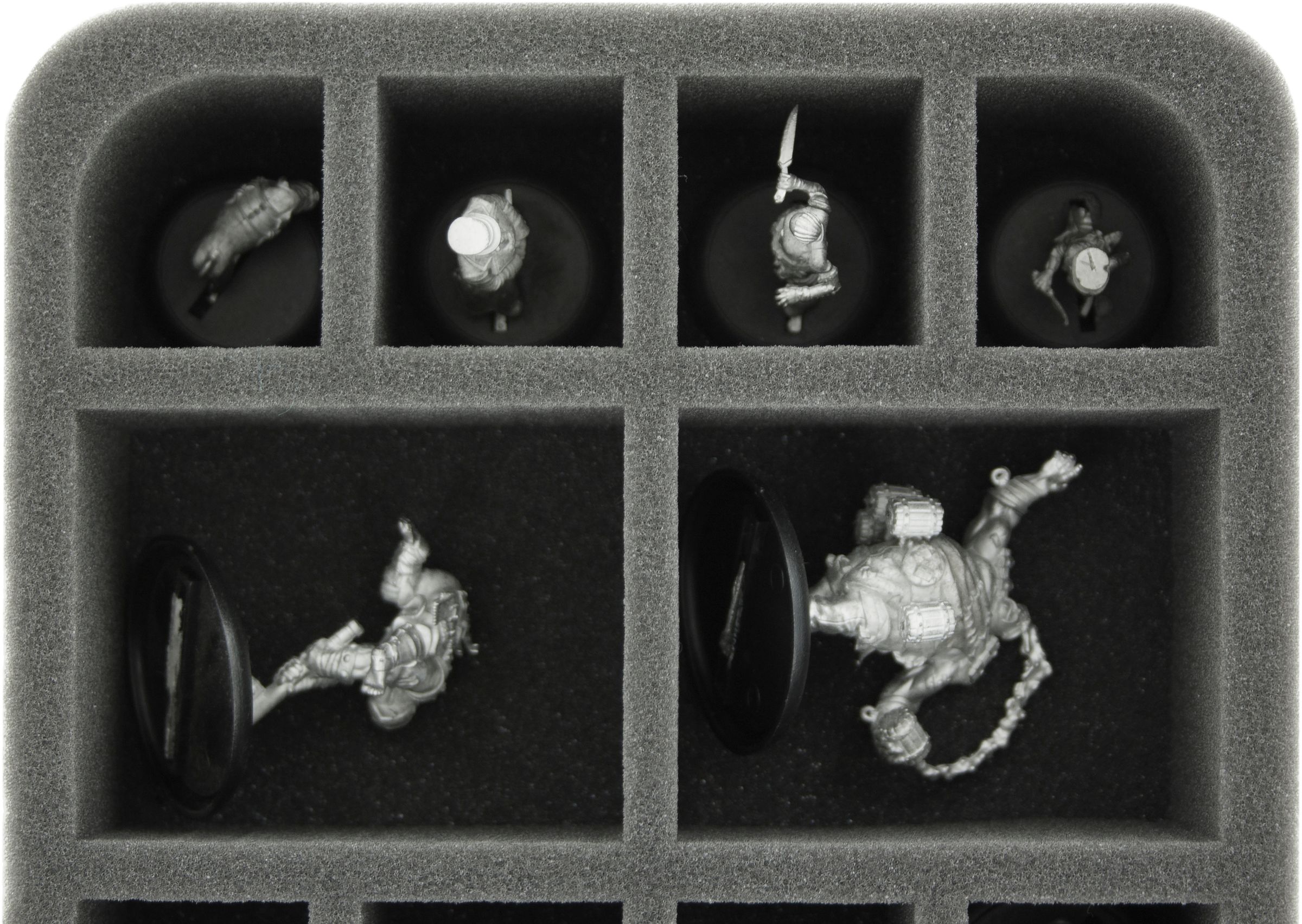The large and small figures of your guild are best stored in the foam tray with 16 compartments. The tray features 4 large and 12 small compartments. The fine-pored foam provides the best possible protection for your athletes – delicate, protruding parts like axes and whips won’t break, the paint of colored models won’t get scratched.