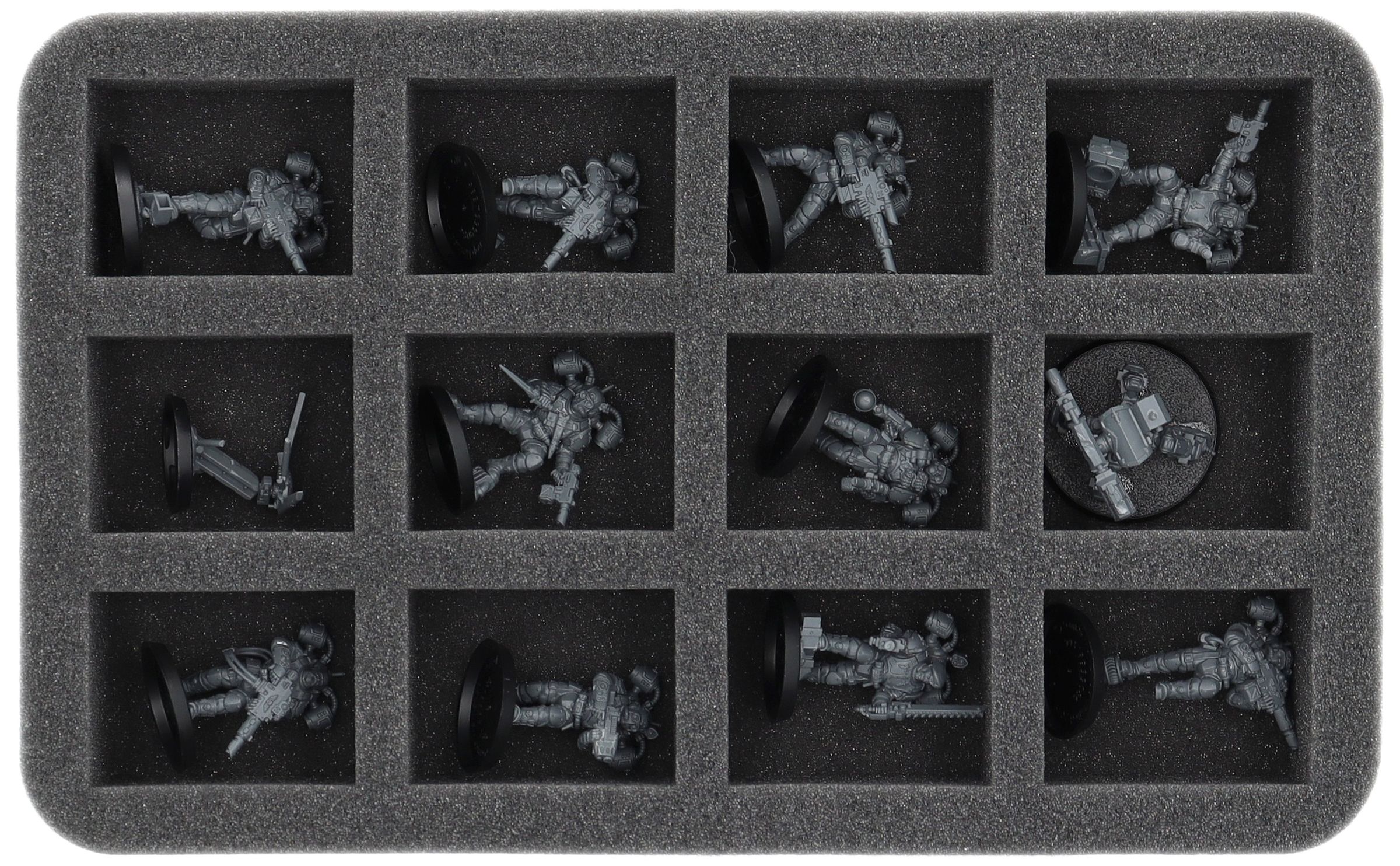 - 2 x HS045I012BO – Half-Size foam tray with 12 compartments each for e.g. Tempestus Aquilon, Vespid Stingwing and further models