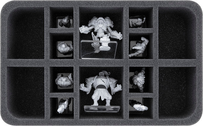 - 1 Half-Size foam tray with 14 compartments for miniatures on 25 and 50 mm base (HS065A013)