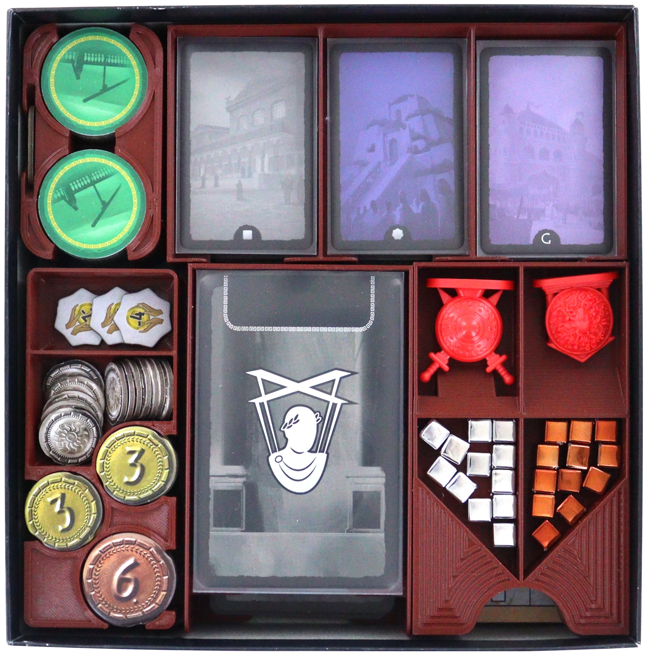 - Store big game components like rule books, Game board, and Senate board on the trays. Place the Pantheon board on the card holders for small-format cards.