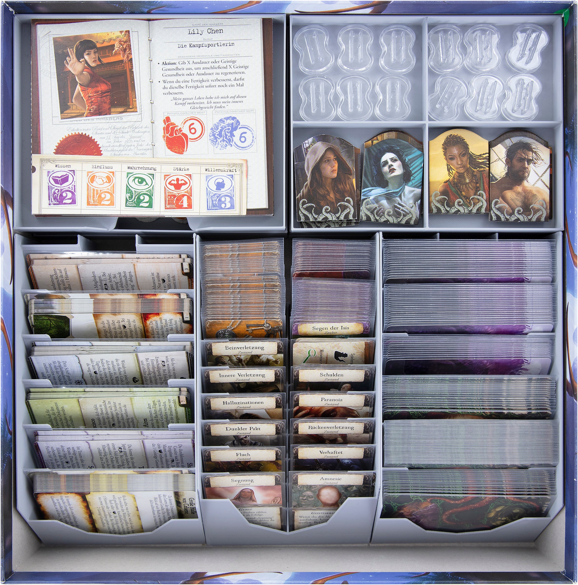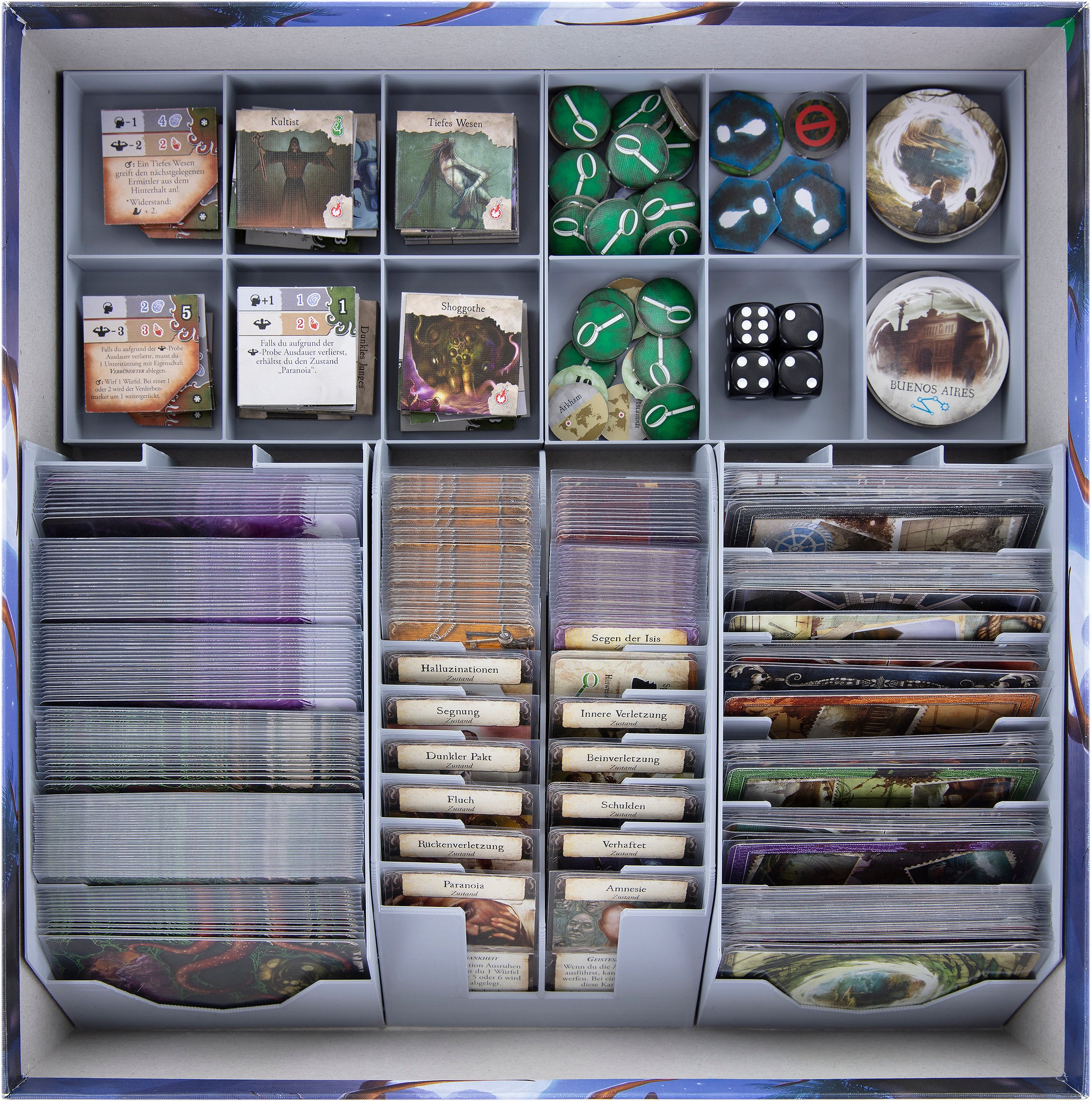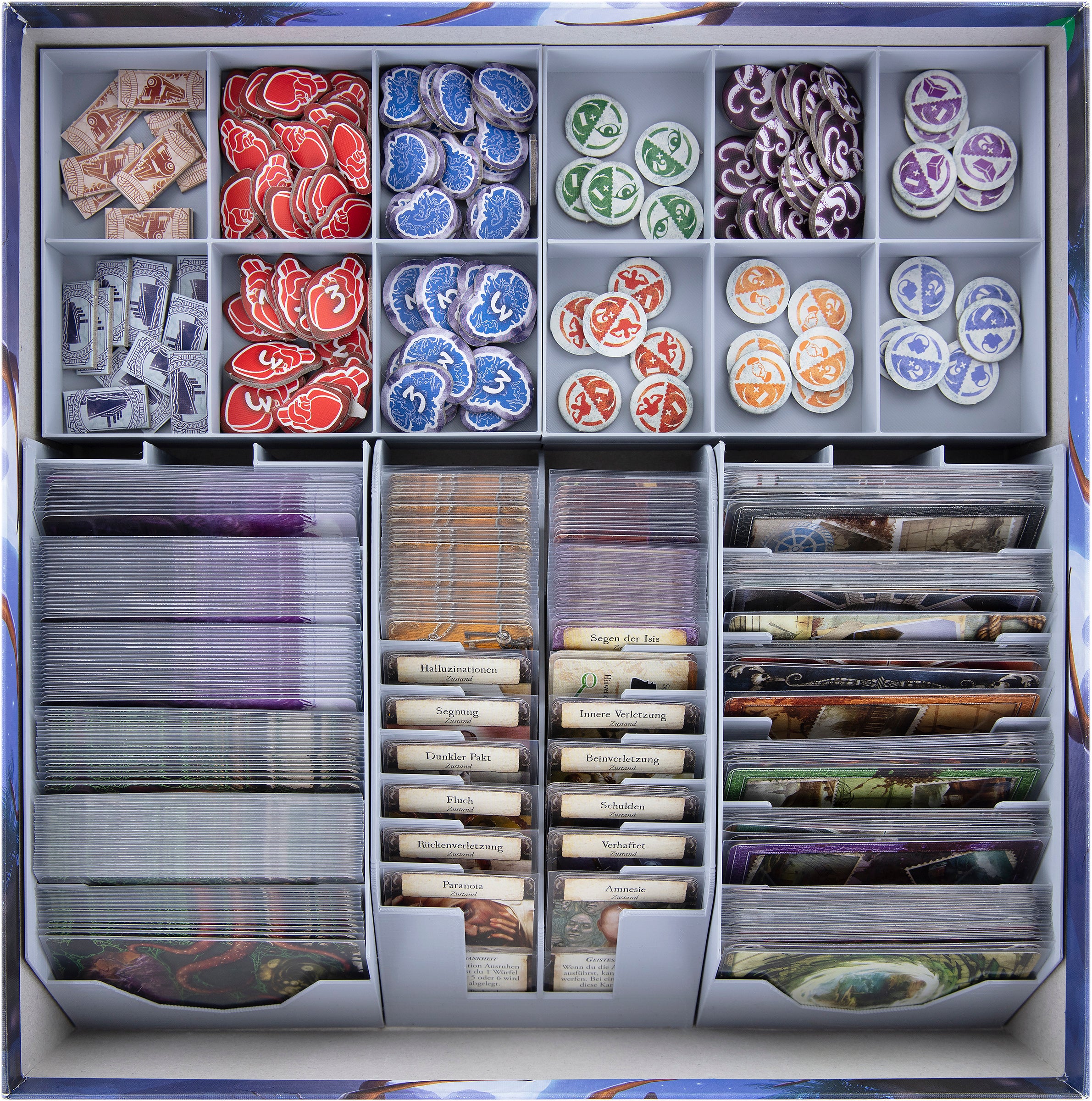- In the 4 token holders with 6 compartments you store Health-, Sanity-, Clue-, Eldritch-, Improvement-, Travel Ticket-, Monster-, Rumor-, Mystery Tokens and Dice.