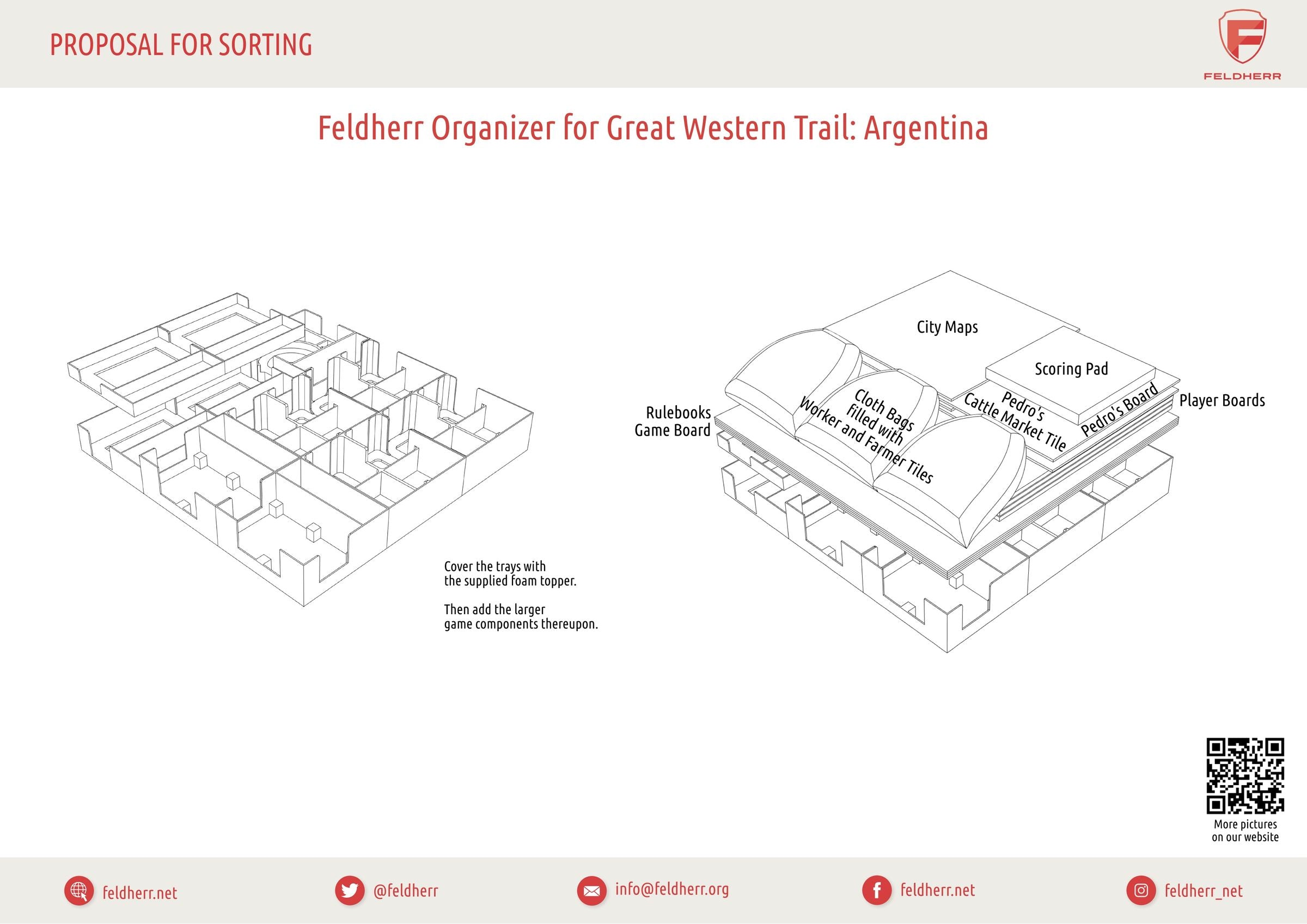 Whether you are playing the 2nd Edition of “Great Western Trail” with or without the “Rails to the North” expansion or engaging in cattle farming in “Great Western Trail: Argentinien” – with this Organizer, you not only create order within the board game box but also on the tabletop. Unleash the cowboy/gaucho within you and dominate the world of cattle ranching with this Organizer.