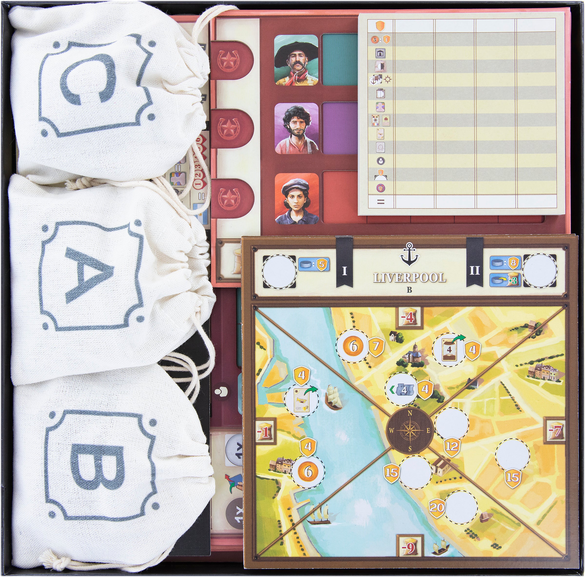 Fill the three cloth bags according to the numbers or letters with the corresponding tiles. This way, you can store them pre-sorted in the game box and use them for drawing individual tiles during the game. The filled cloth bags are stored on the plastic inserts next to the player boards.