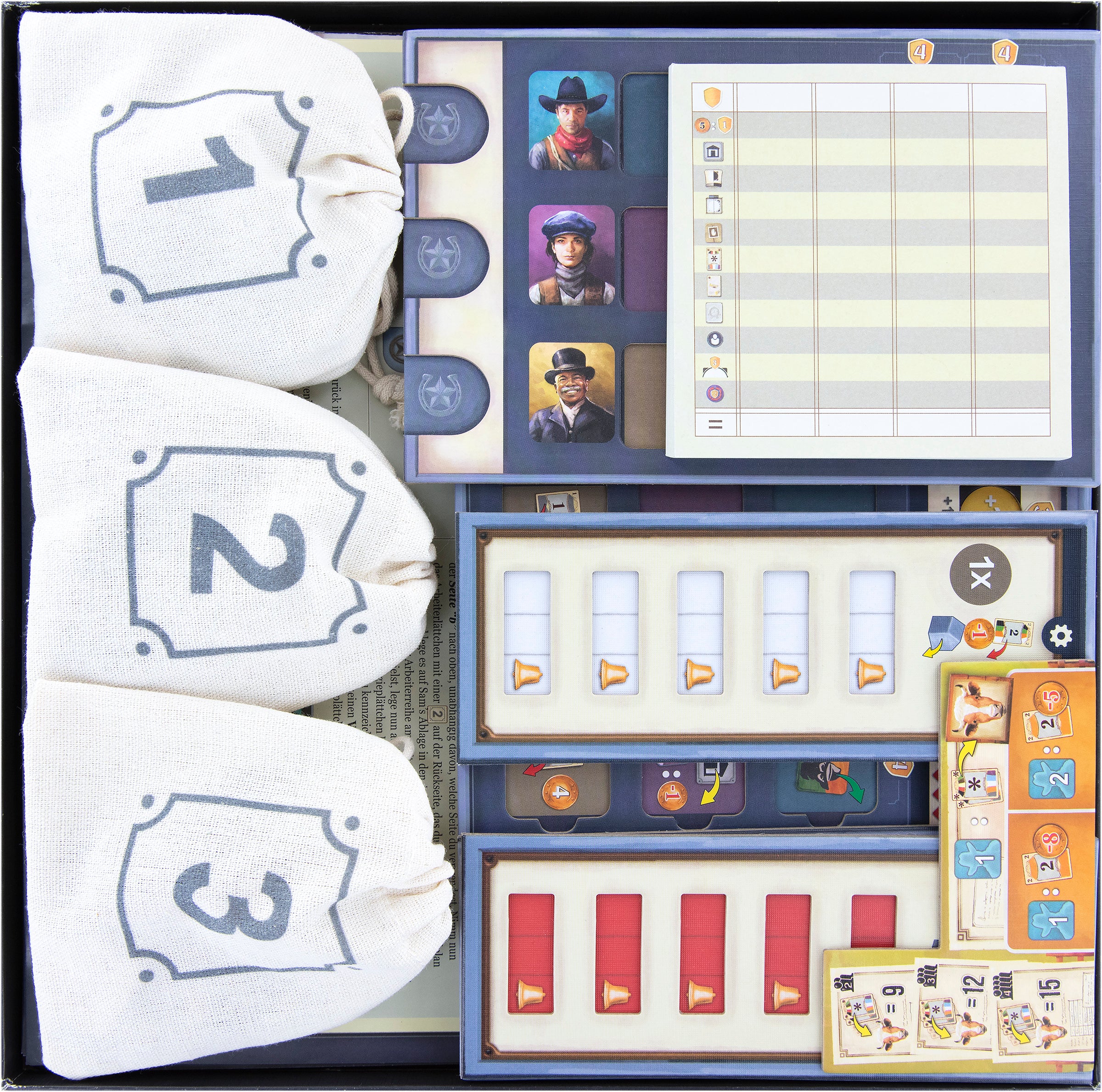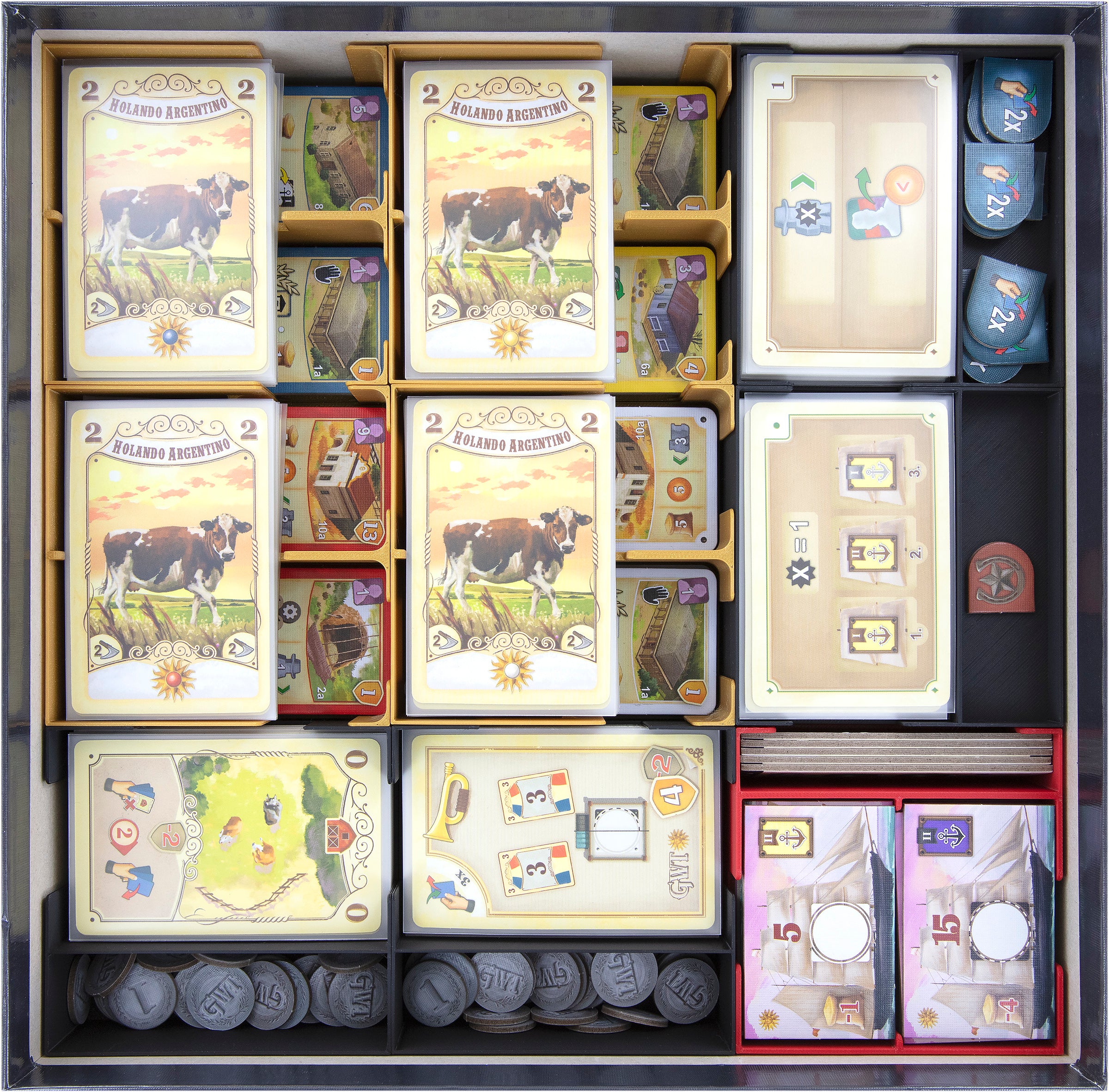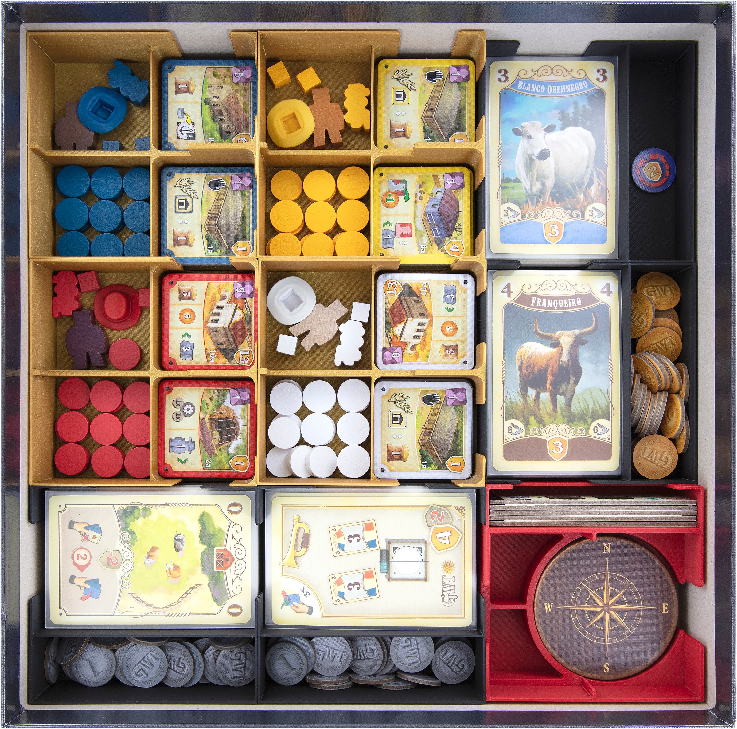 - 2 tall plastic card holders, each with 2 compartments for cattle cards and small-sized game components like coins, markers, and indicators