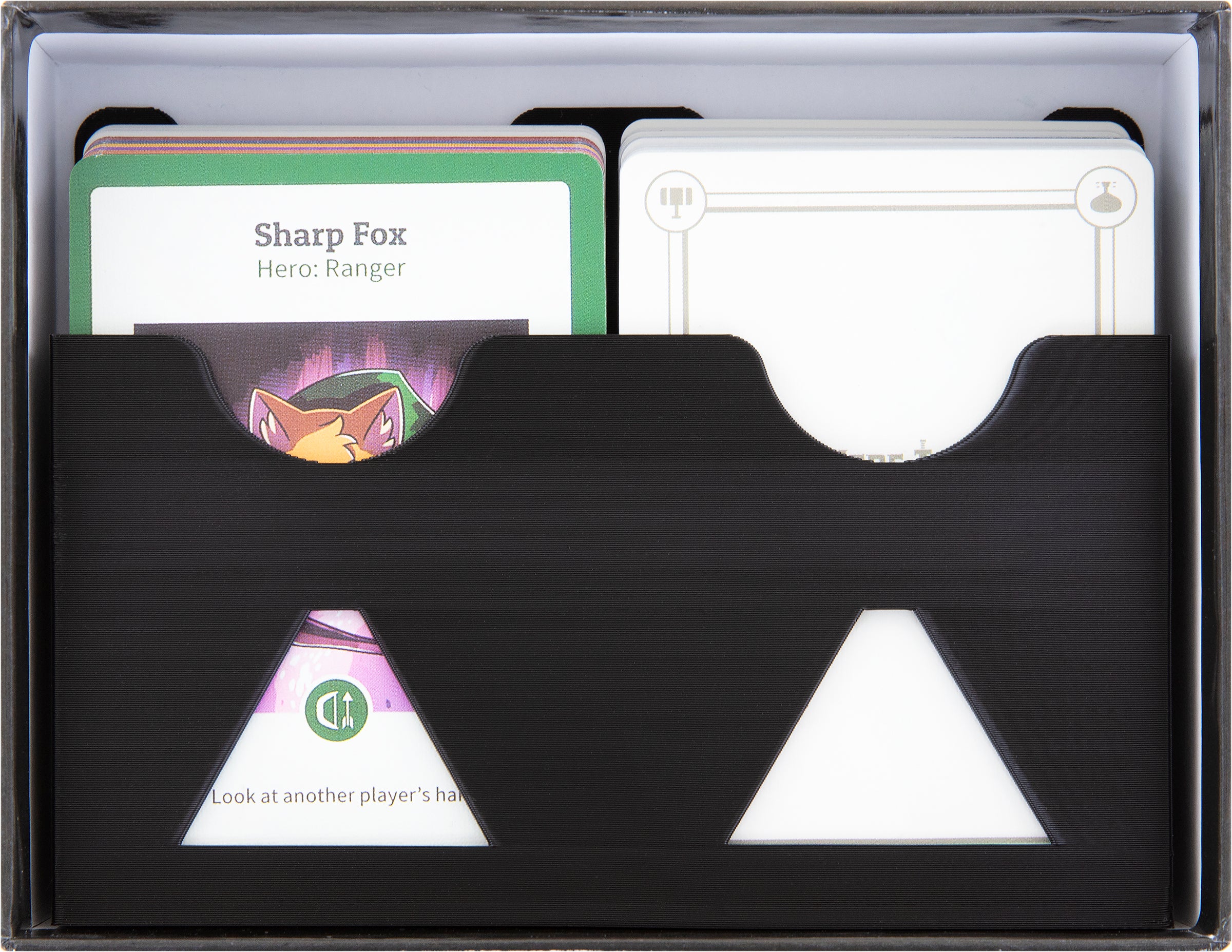 - 1 plastic card holder with two compartments for normal-sized cards like support cards (hero, item, magic, modifier, challenge) and rules reference cards