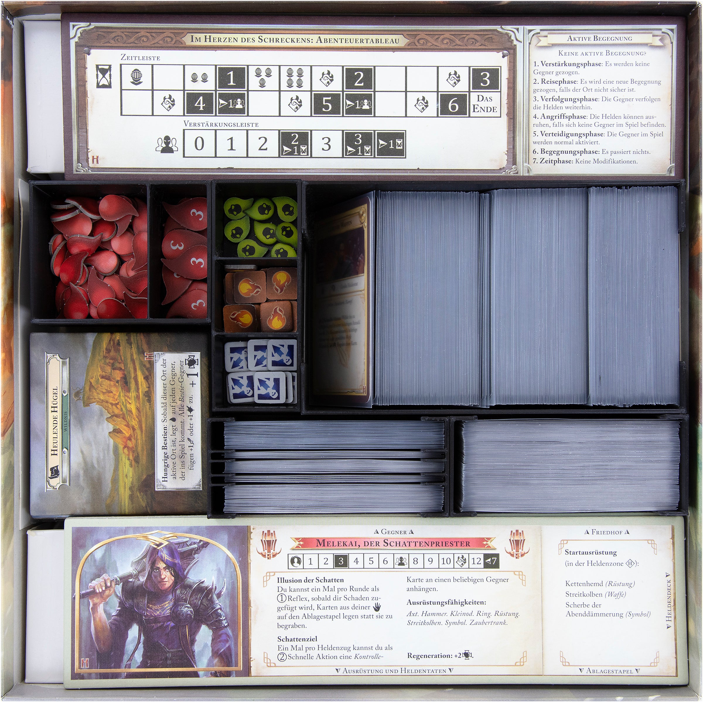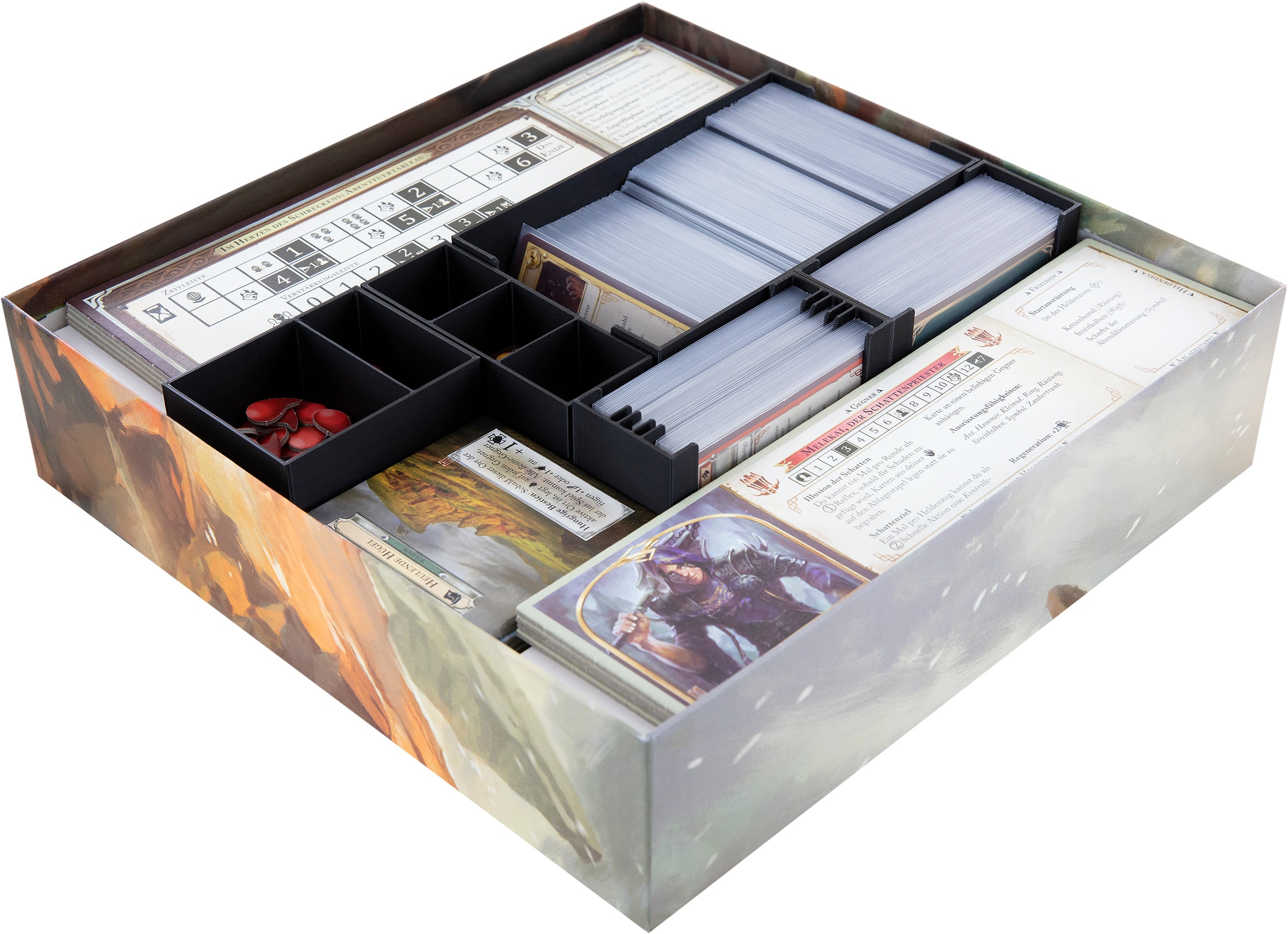 Not so easy to maintain a clear view with more than 320 cards and over 150 markers. Fortunately, we have the matching Feldherr Organizer for the original board game box of “Mistfall: Heart of the Mists.” With it, you can easily sort the cards by type and give the game material the necessary structure. This allows you to always find the right marker, even in the heat of battle. You keep track of everything, and the forces of evil are quickly left behind.