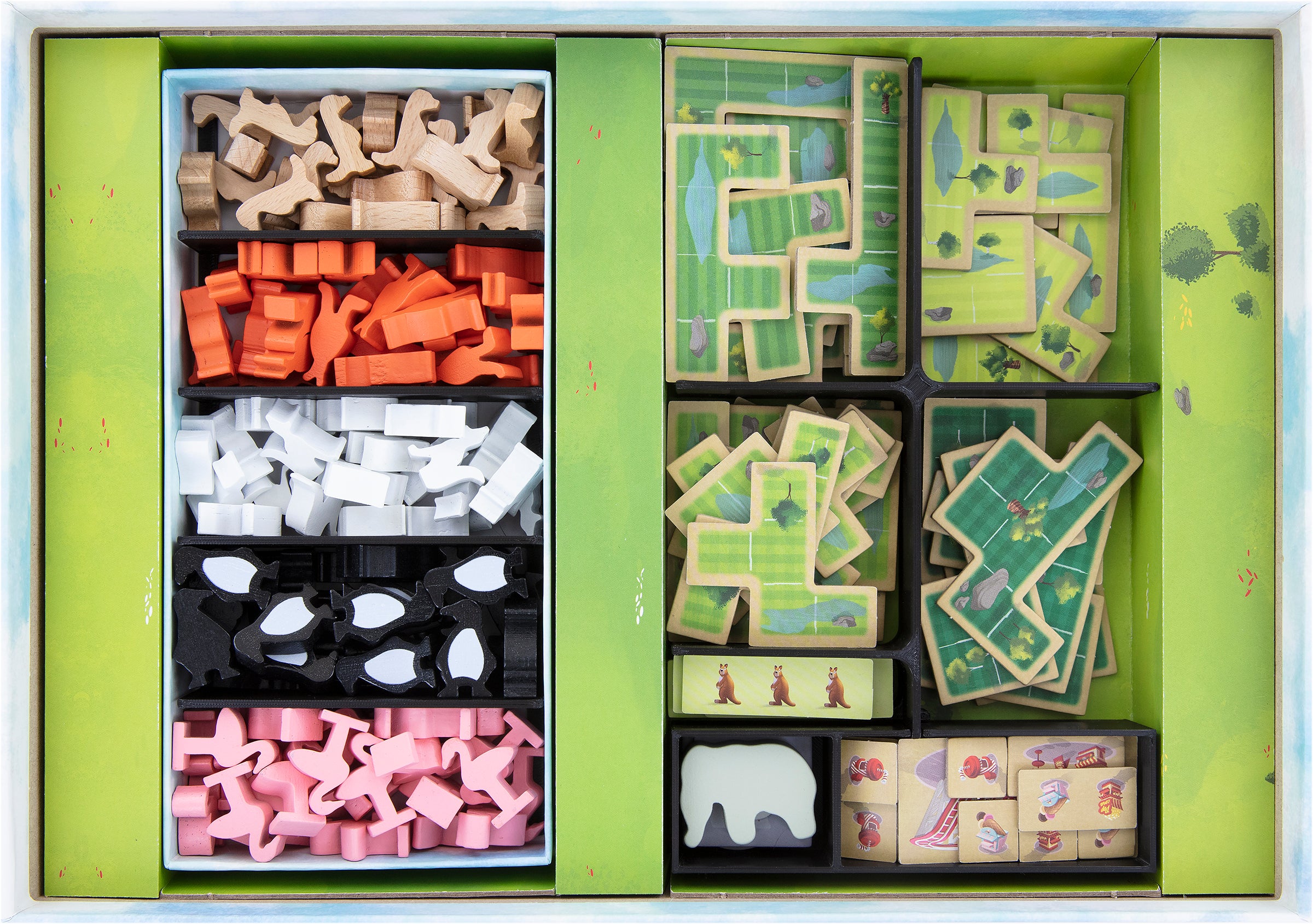 All wooden animals, markers, and tiles are given a matching compartment each. So you save time-consuming pre-sorting and can put the time saved directly into the expansion of the zoo.
