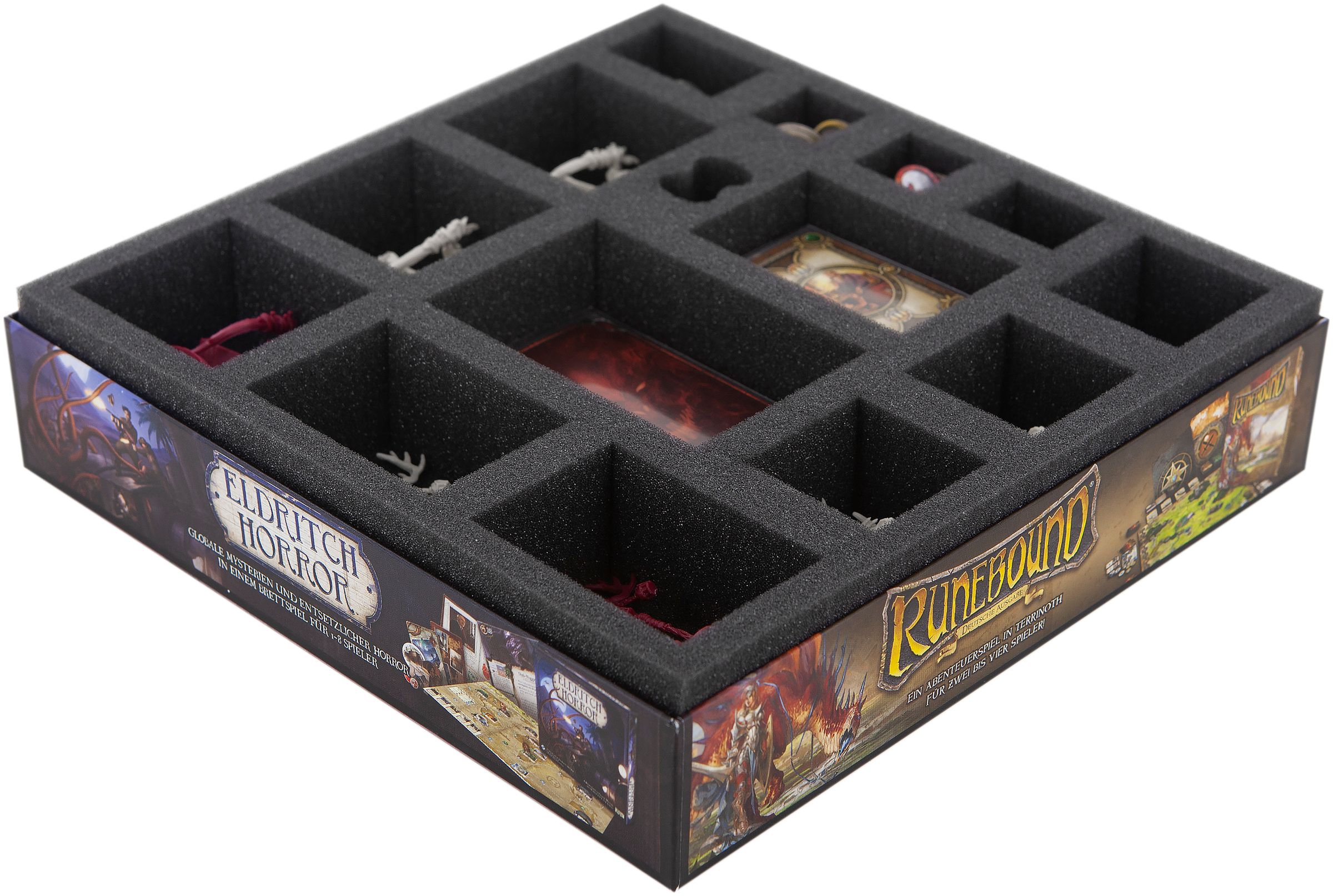 To keep the eight new monster figures undamaged, Feldherr has created this foam tray set for the original Descent: Journeys in the Dark 2nd Edition - The Chains That Rust board game box. It was specially developed to fit the original board game box. The foam tray and the matching topper are made of chlorine- and acid-free foam.