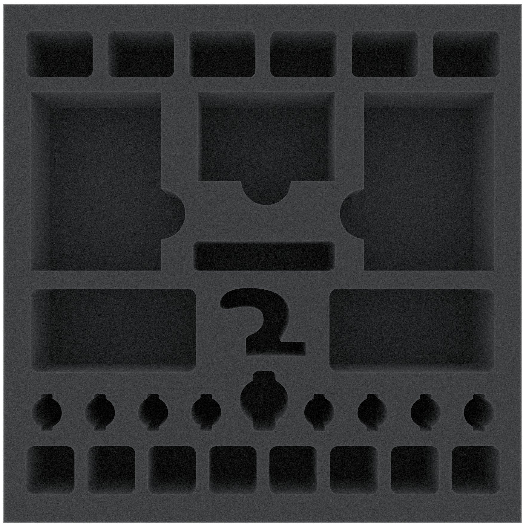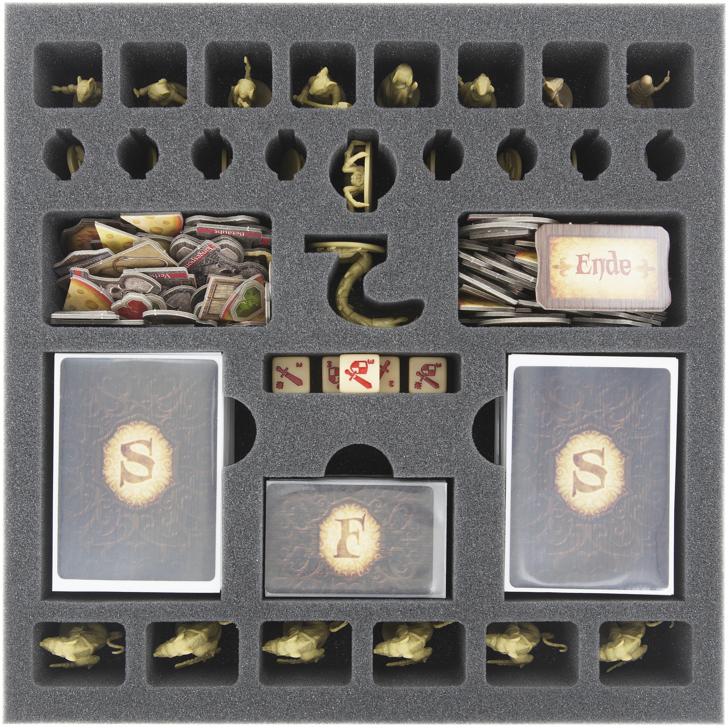 This foam tray is especially designed for Mice and Mystics. In the foam you can not only protect and transport your material of the original game box but also the equipment of the Heart of Glorm expansion. In the 30 compartments you can stow your mouse and enemy figures, the different cards in sleeves, tokens and dice in shaped cut outs. The mat fits in the original game box. Along with the Rule Book, Story Book, Story Control Board and Room Tiles the foam extends slightly over the edge of the board game box.