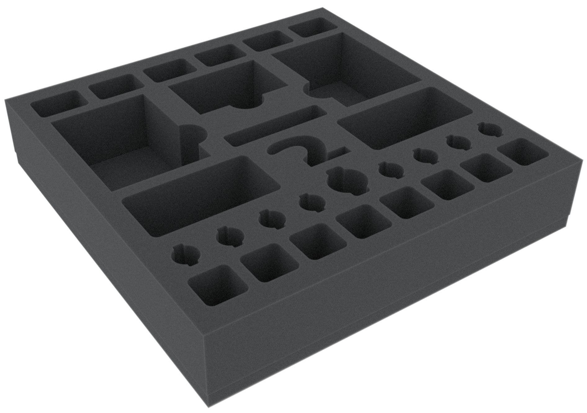 The Feldherr foam tray has the dimensions: 285 mm x 285 mm x 50 mm height. The 50 mm depth of the foam is result from 10 mm foam base and slot foam tray with 40 mm effective depth