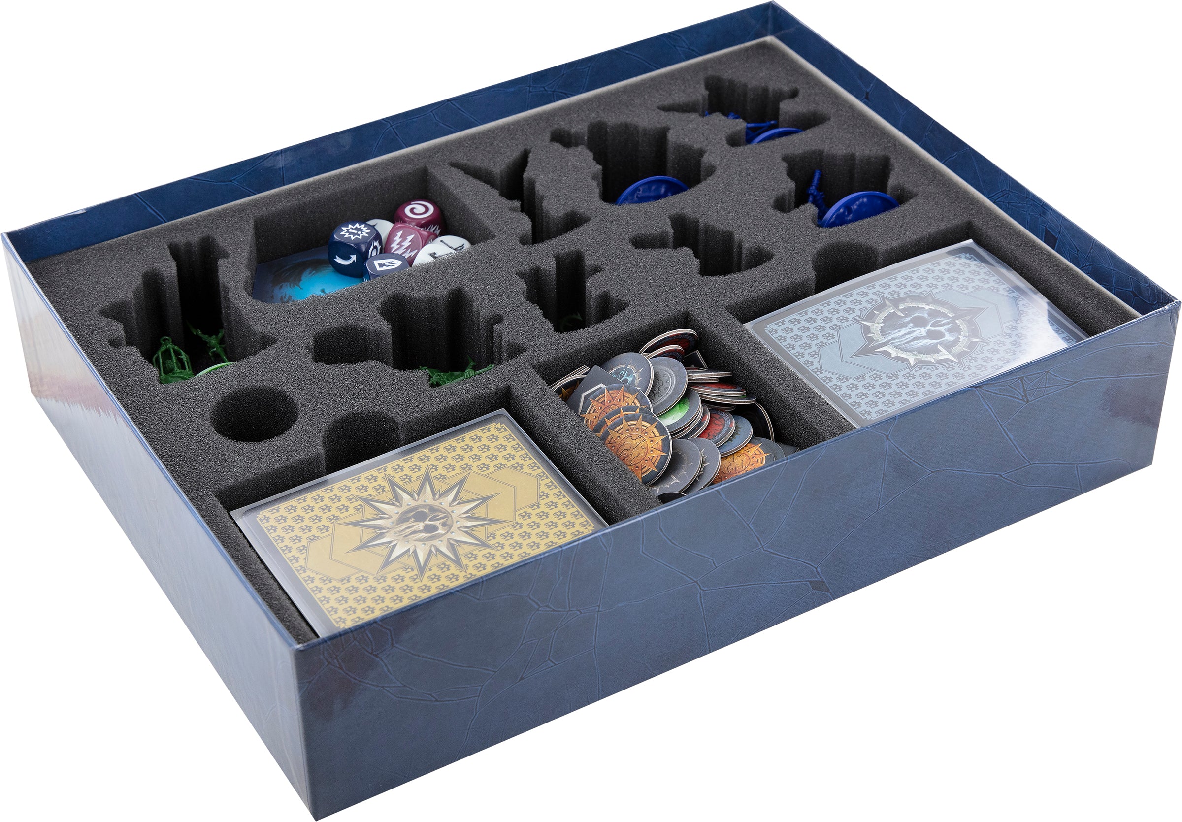 But before going below the sea, other dangers must be overcome. Broken limbs, lost tokens, bent cards are just a few of the dangers lurking in the darkness of your board game box. To keep all the contents of the Harrowdeep core game safe and tidy, we have the matching Feldherr foam set for your needs. With it, you'll be well-prepared for your expedition into the darkness.