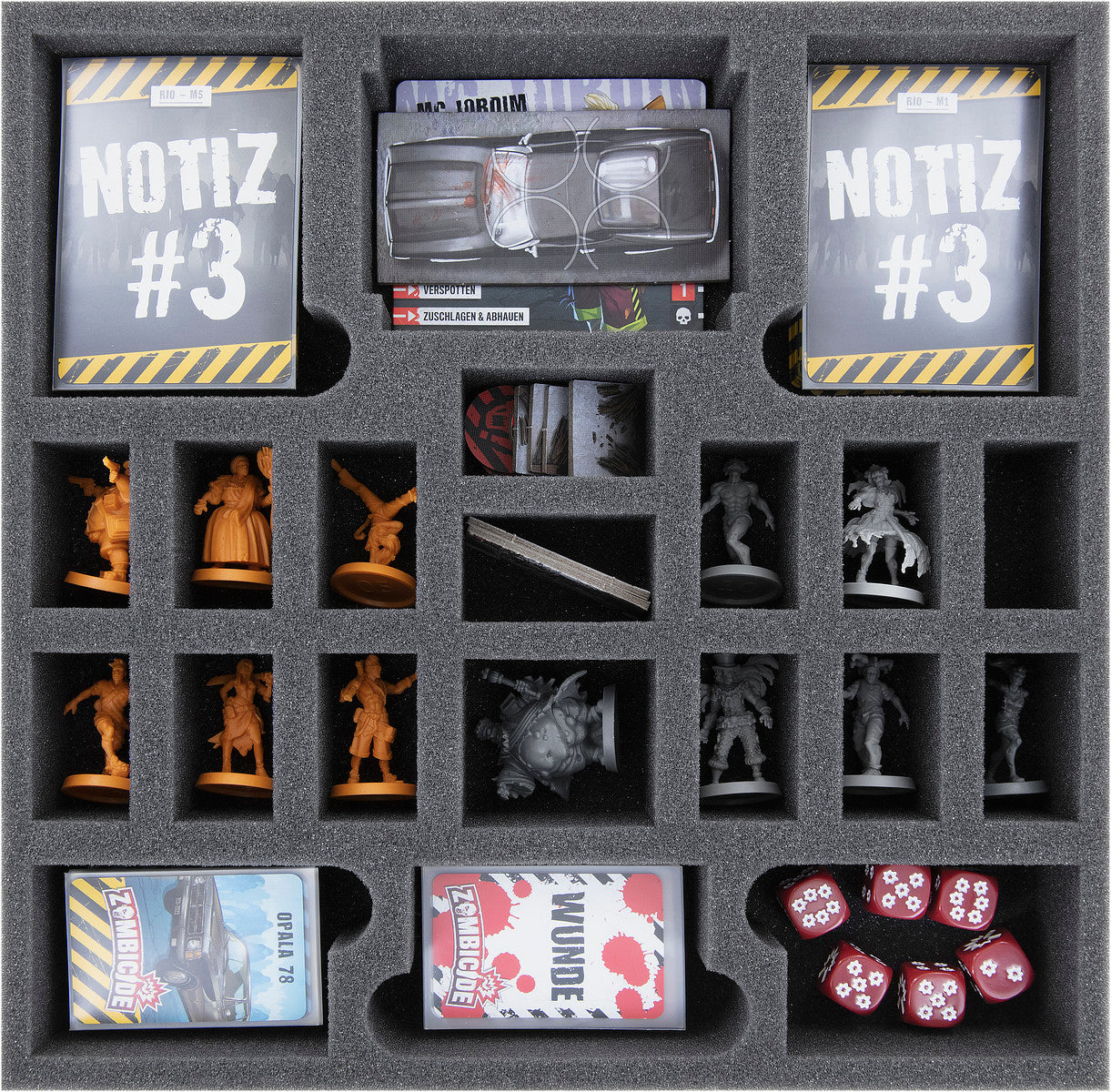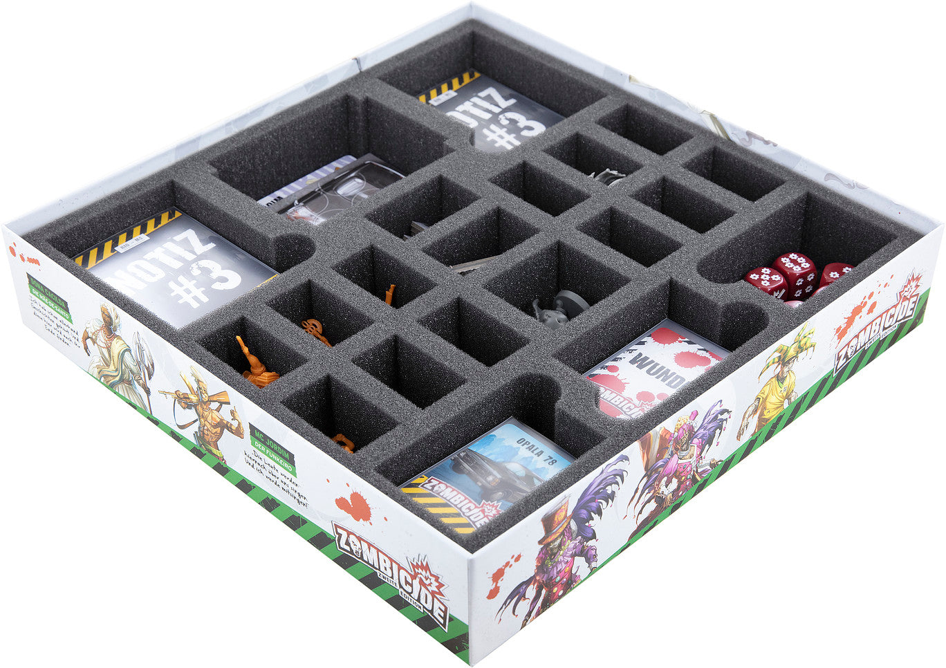 For your 12 miniatures and game materials, we included a 50 mm high insert into the set. Custom-fit cut compartments offer ideal protection for survivors like Eliete, Steven, and Dona Cacilda, as well as rotting undead like Walkers and Brutes.