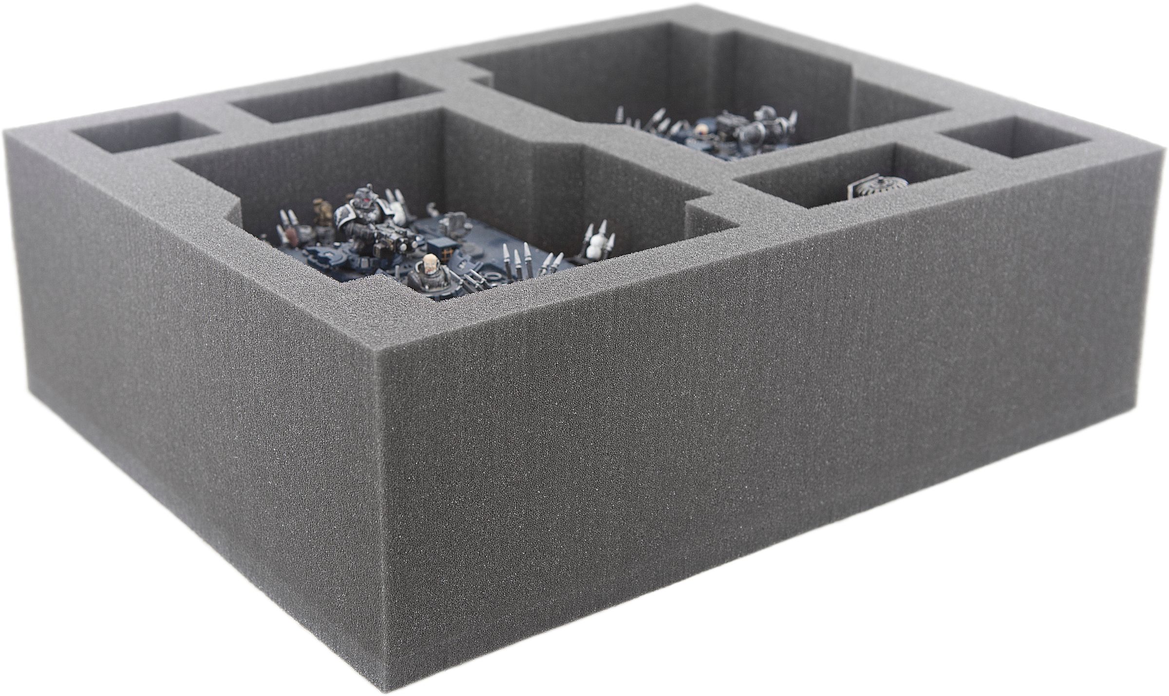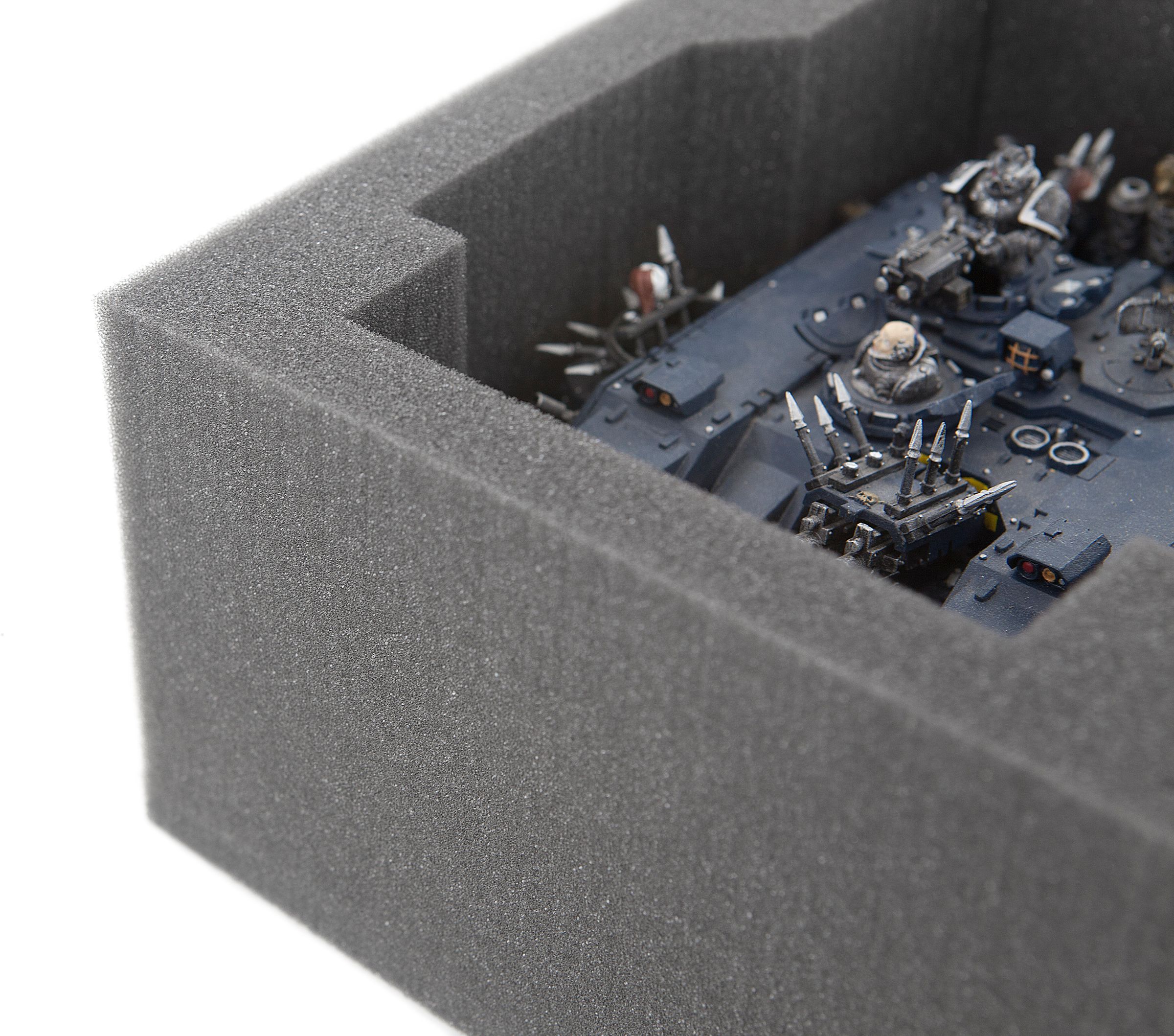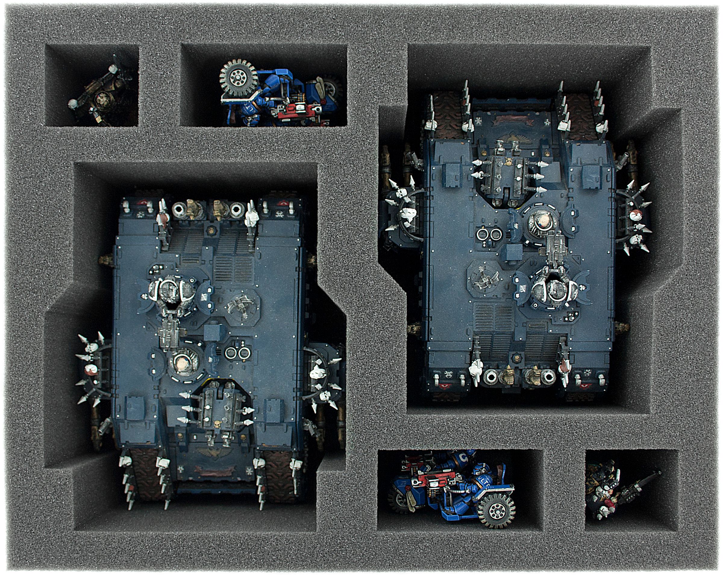 You can park two Land Raiders in this Feldherr Full-Size foam tray with six compartments. The four remaining compartments can be used for infantry and character models like a Terminator Captain, Chaplain in Terminator Armor or similar sized miniatures.