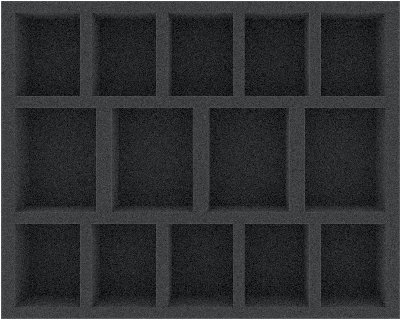 This Full-Size foam insert is divided into 14 compartments in 2 different sizes. The insert is particularly suitable for larger and bulky tabletop and board game 28 mm scale miniatures on bases up to 40 mm.