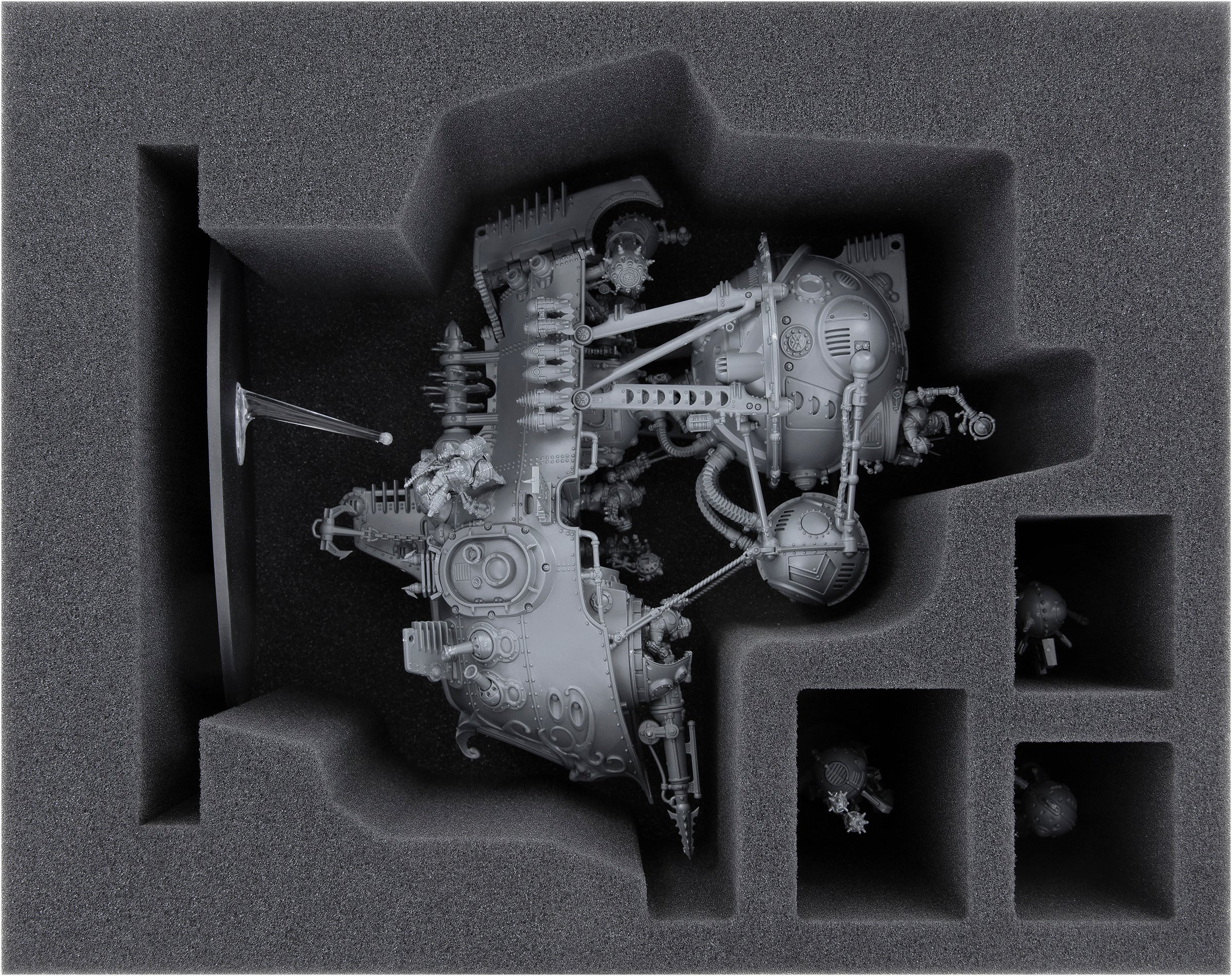 To prevent the delicate textures and decorations from being marred by broken details and scratched surfaces, there is this matching Feldherr foam tray for your airship and three other miniatures.