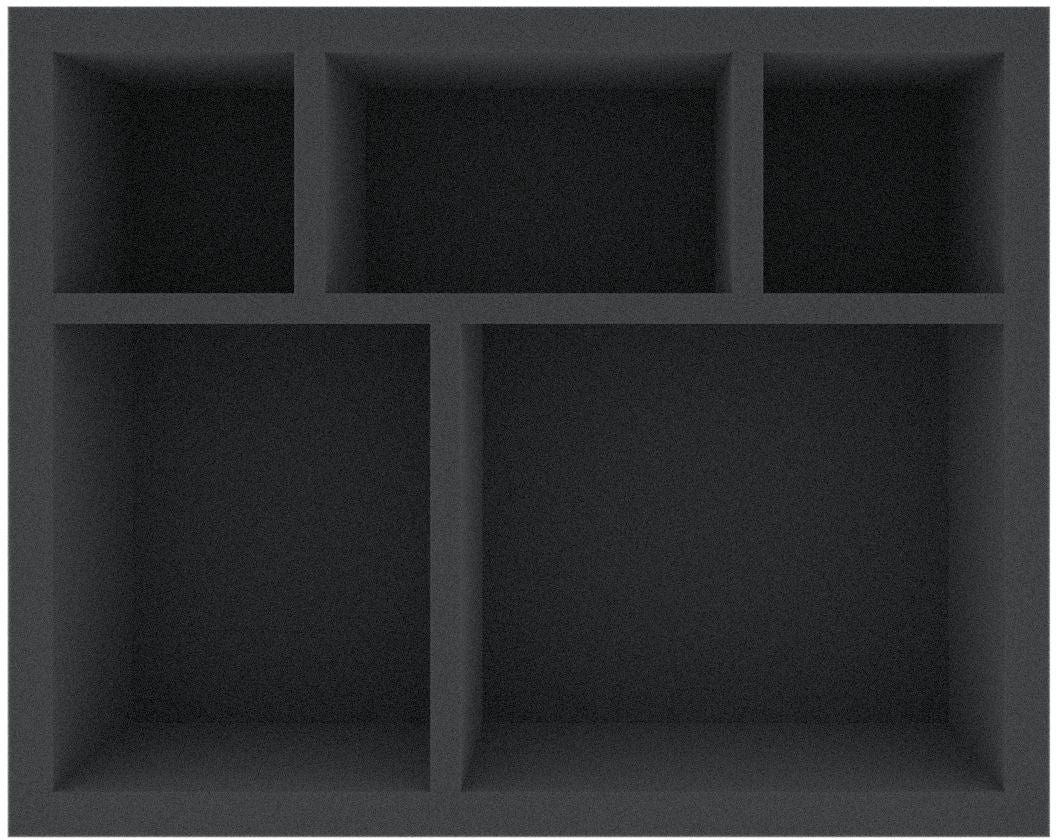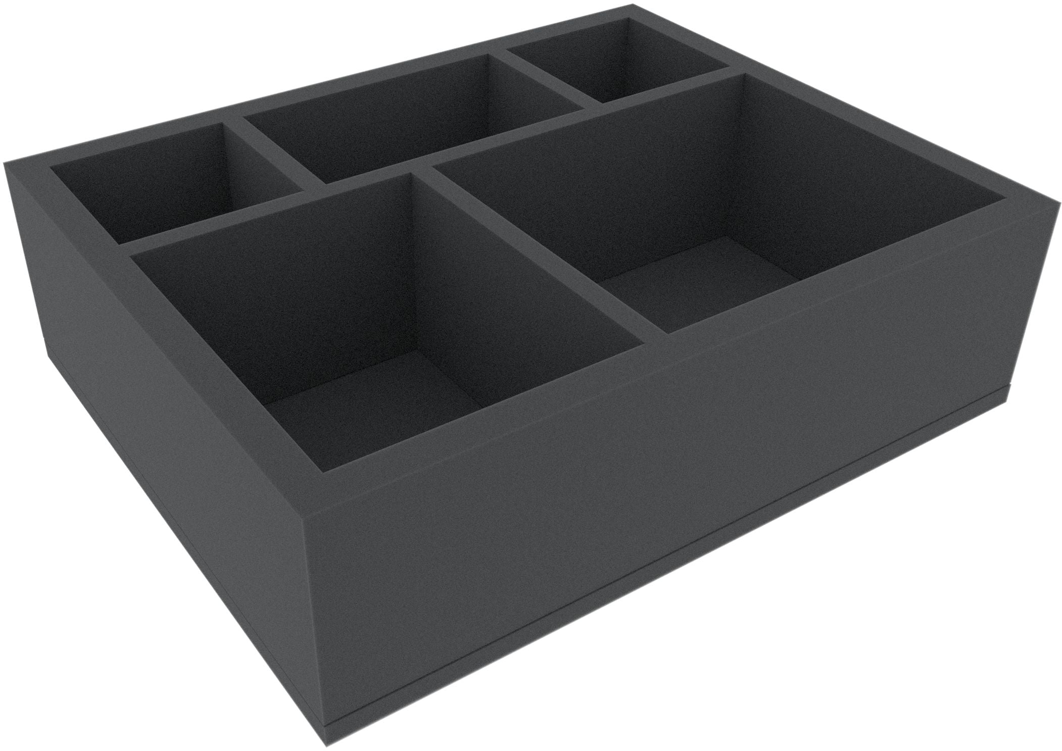 This 100 mm high foam tray is divided into 5 compartments. It is particularly suitable for the safe storage of tabletop and board game miniatures, as well as other fragile models and small parts.