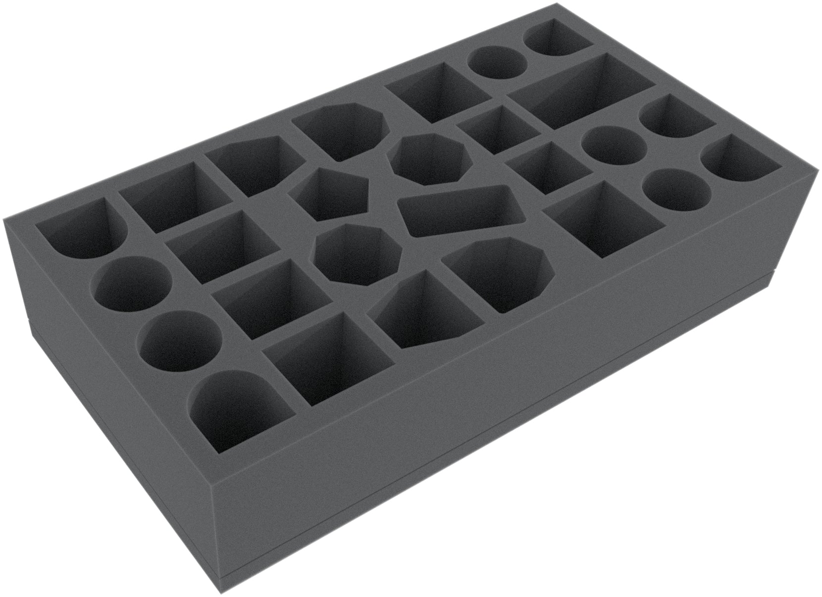 Die Schaumstoffeinlage hat die Abmessungen: 295 mm x 160 mm x 65 mm Gesamthöhe (55 mm Nutzungshöhe + 10 mm Schaumstoffboden).