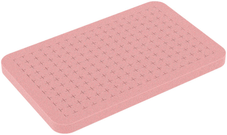This foam is perforated with a raster of 14 mm x 14 mm. A circumferential border is not perforated and increases the stability of the fitted foam insert. The grid allows the tool-free adjustment of the foam inserts to your needs. The article will be delivered without bottom foam sheet. As a bottom we offer for example the articles HS010BESD or HS020BESD.