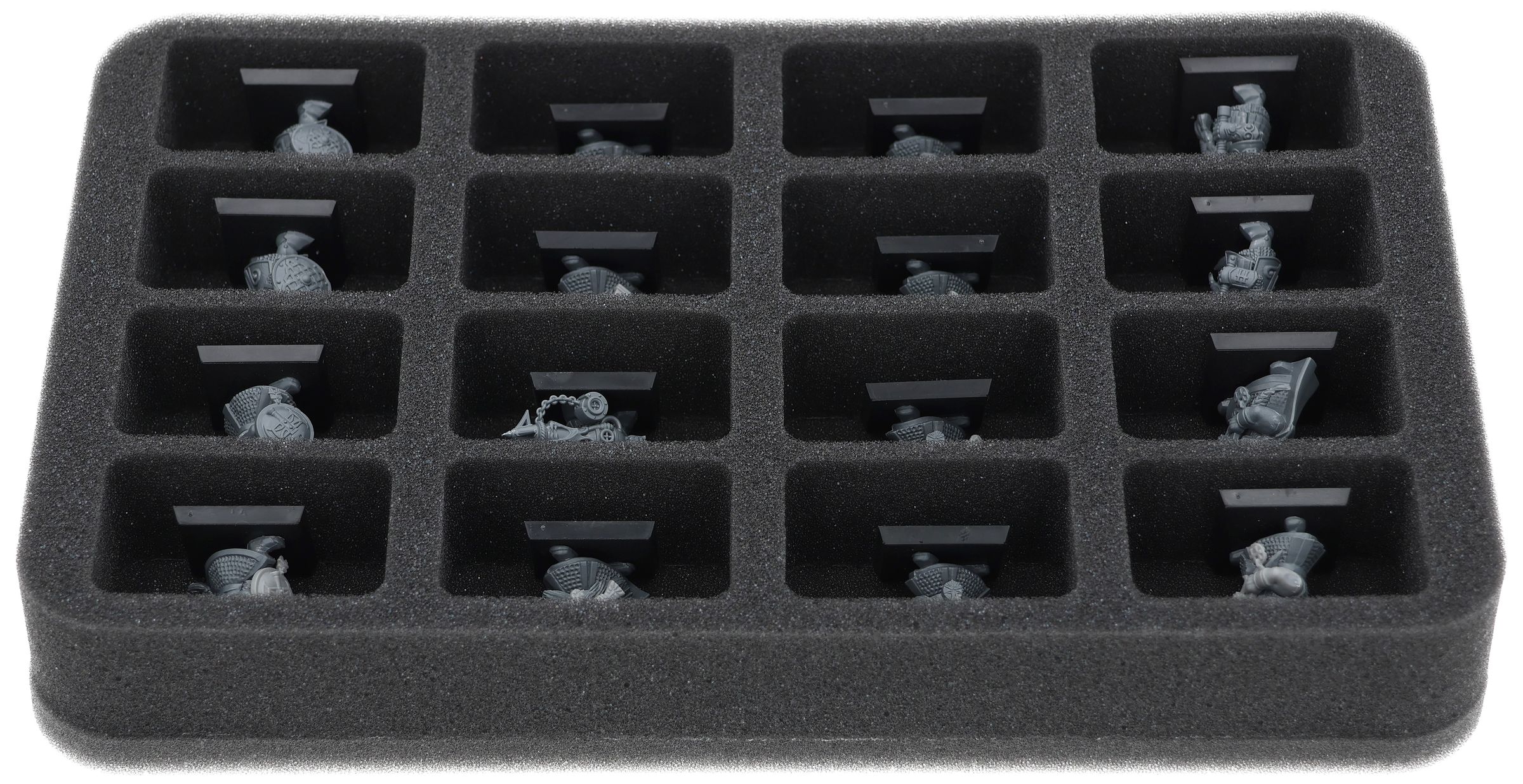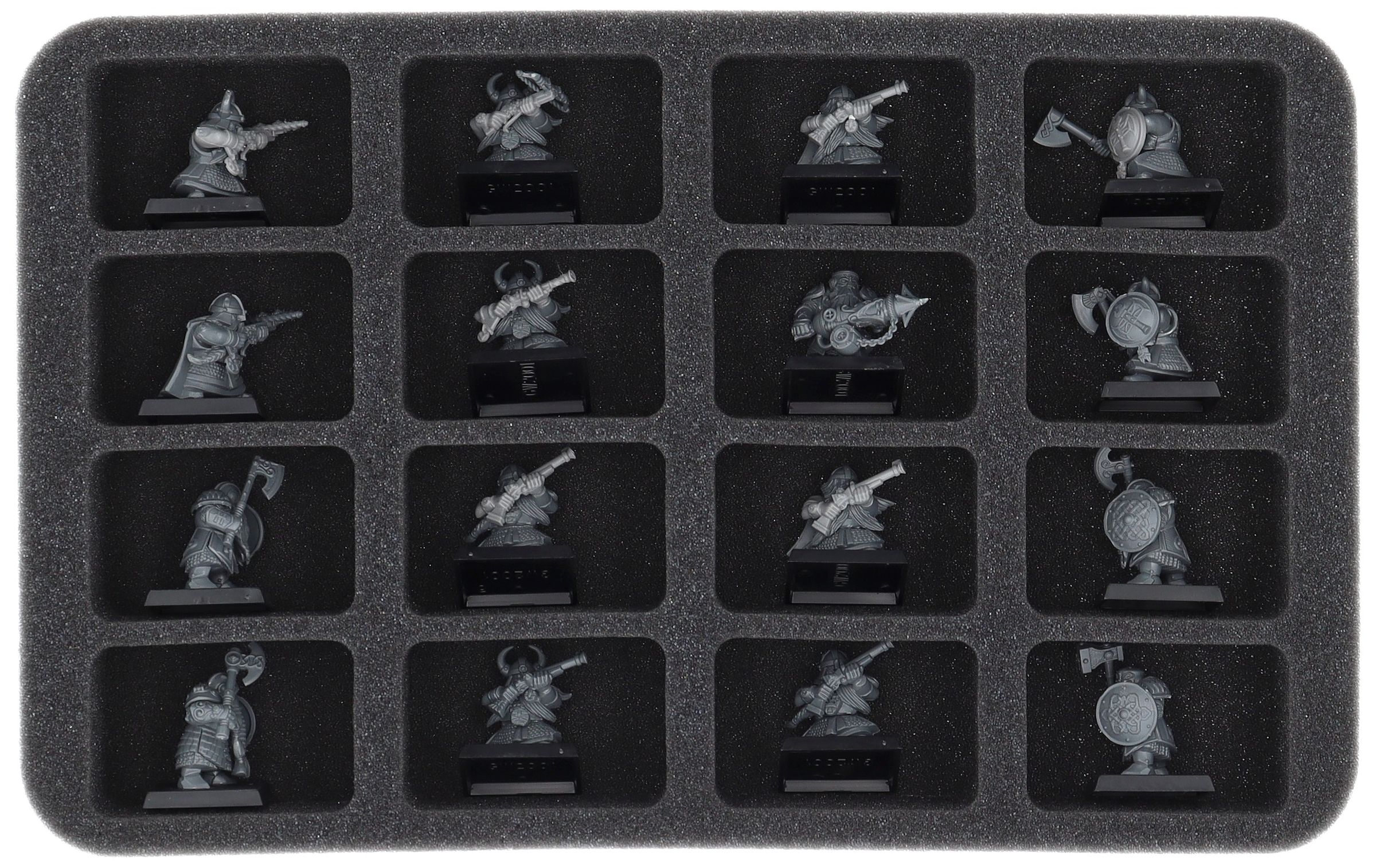 On this Feldherr foam tray you have space for up to 16 miniatures of your army. The insert is especially suitable for storing the Dwarf Warriors, Dwarf Quarrelers, Dwarf Ironbreakers, Dwarf Hammerers, Dwarf Slayers and similar sized models.
