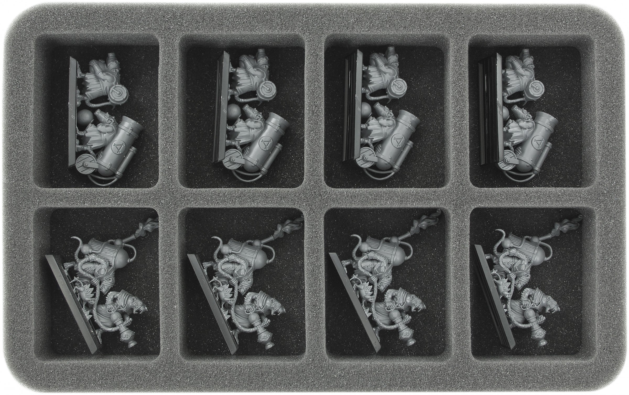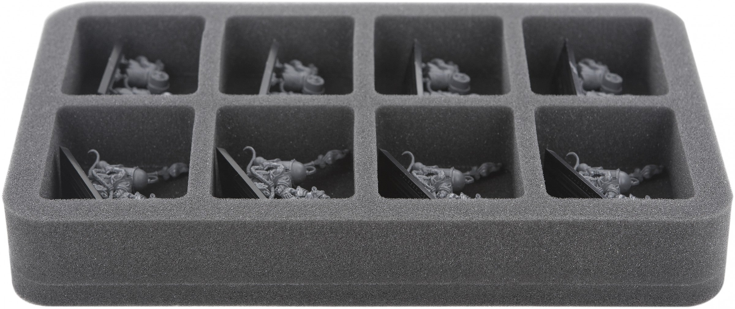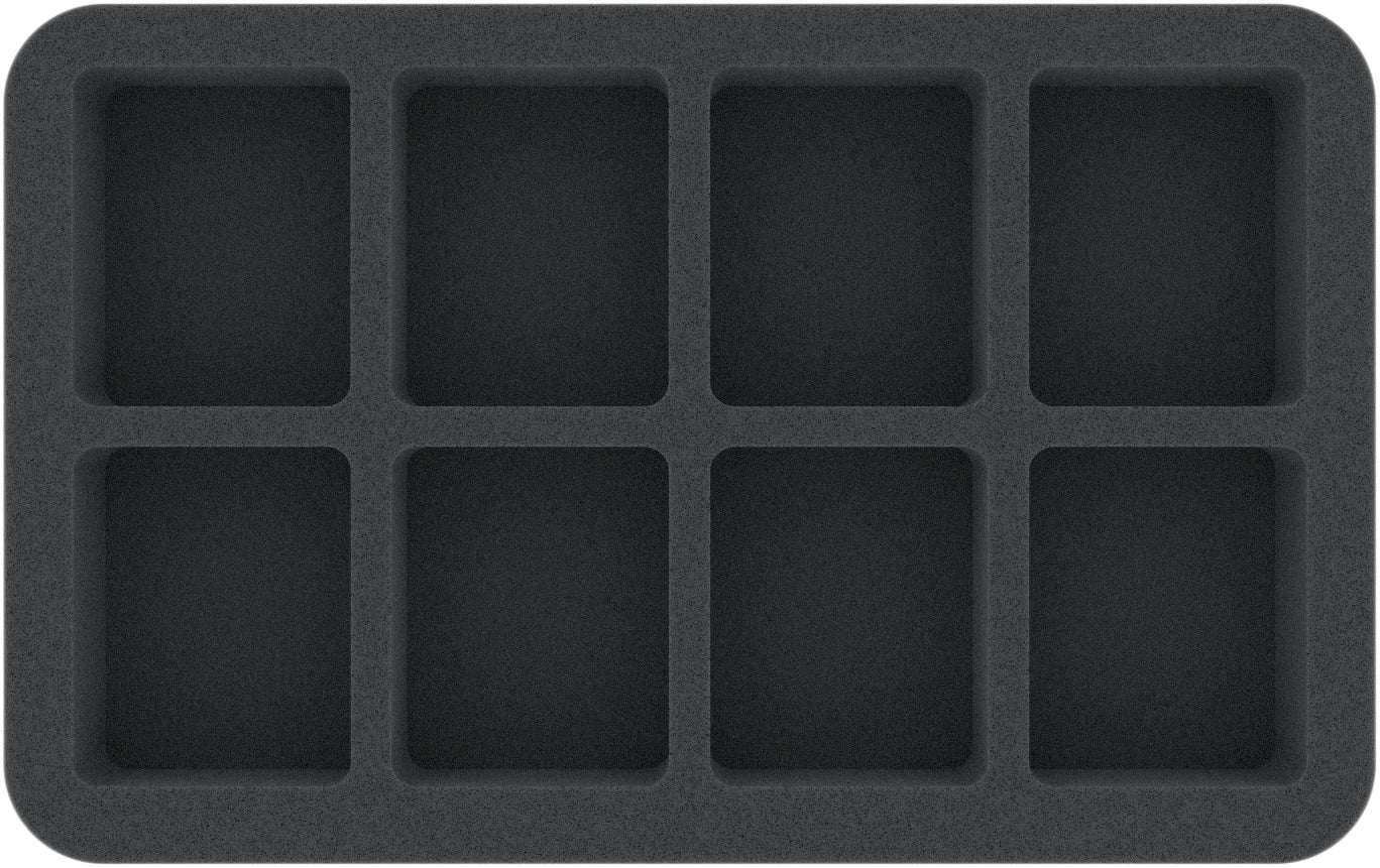 This foam tray features 8 same-sized compartments for the safe and orderly storage of small or medium-sized miniatures. The fine-pored foam provides reliable protection against damage – delicate parts stay intact, the color of painted models remains unharmed. The tray is also suitable to organize small game material like e. g. tokens.