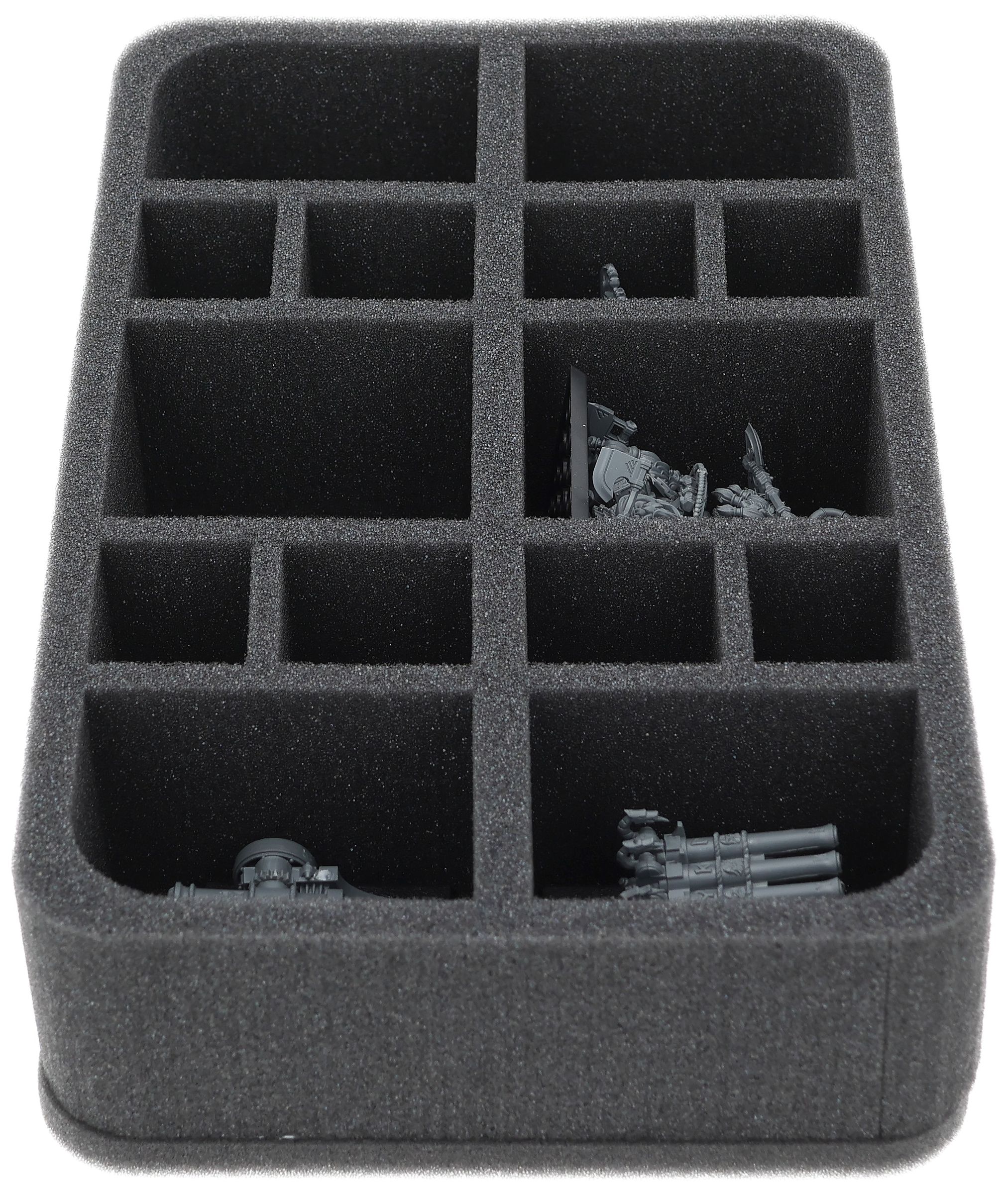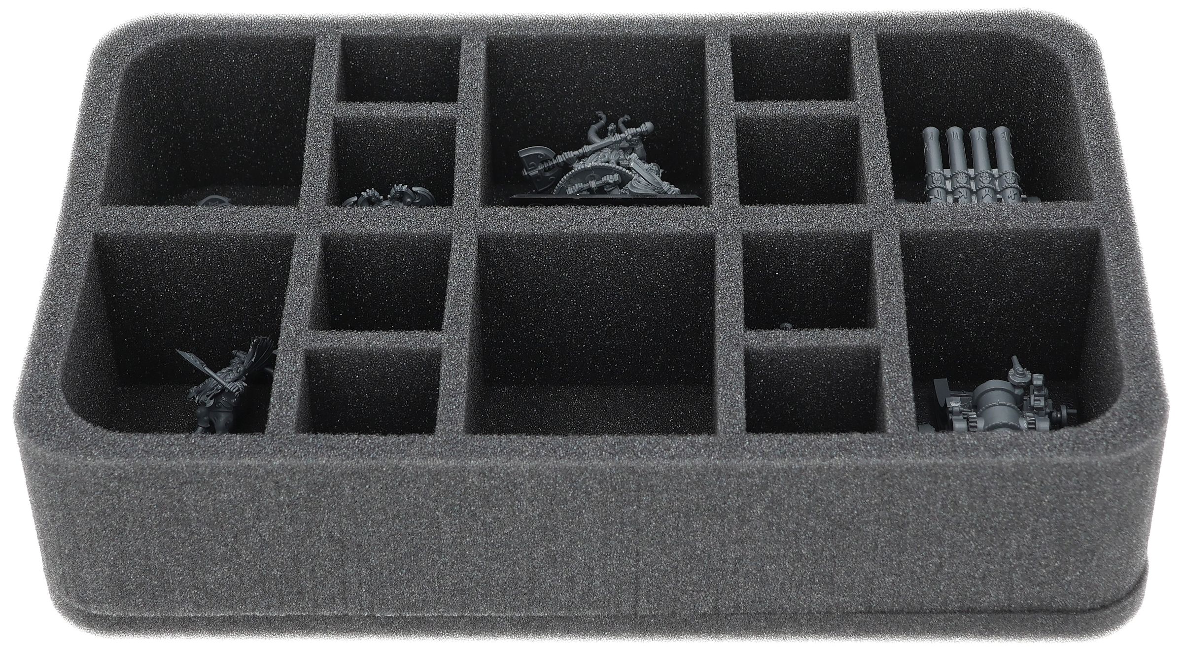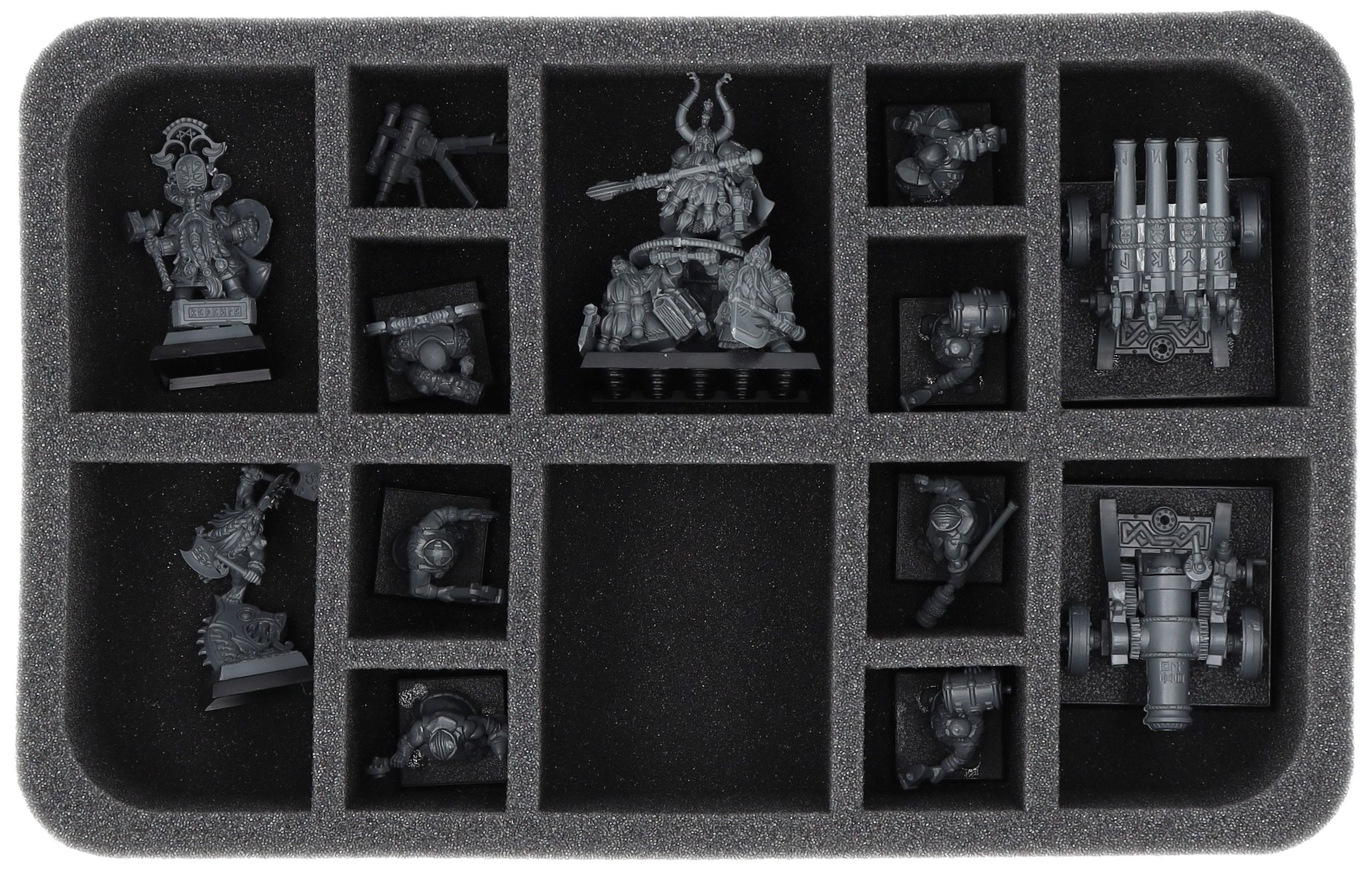 On this Feldherr foam tray you have space for up to 14 miniatures of your army. The insert is especially suitable for storing the Dwarf King With Oathstone, Dwarf Slayer of Legend, Dwarf Lords with Shieldbearers, Dwarf Cannon & Organ Gun and similar sized models.