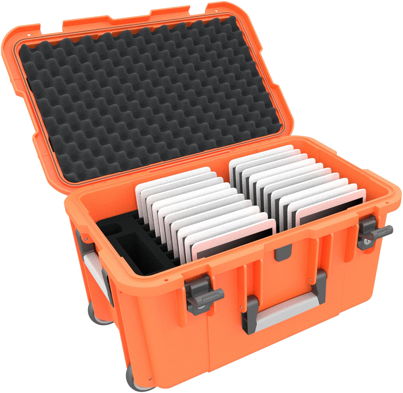 With this set, the space requirement of robust protective covers has been brought into a very good ratio to the number of devices. The compartments are wide enough for large cases and optimized in length so that a remarkable 20 tablet computers can be stowed in two rows. With this set of trolley and foam insert, you can store your tablets clearly and easily transport them.