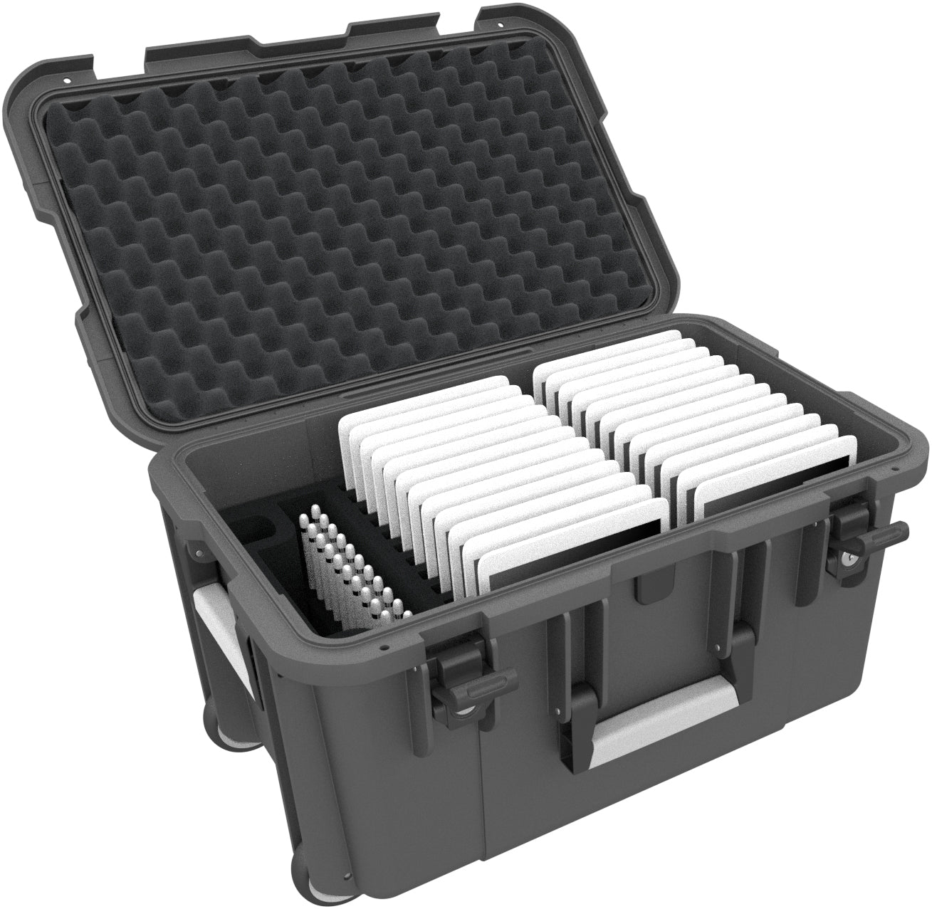 With this trolley, you can transport a set of tablets for a whole school class. You get a clear and easy-to-use solution! In addition to the tablets' slots, the foam insert has a larger compartment for storing accessories, such as charging cables or power packs. This set also includes a removable insert for 24 digital pencils.