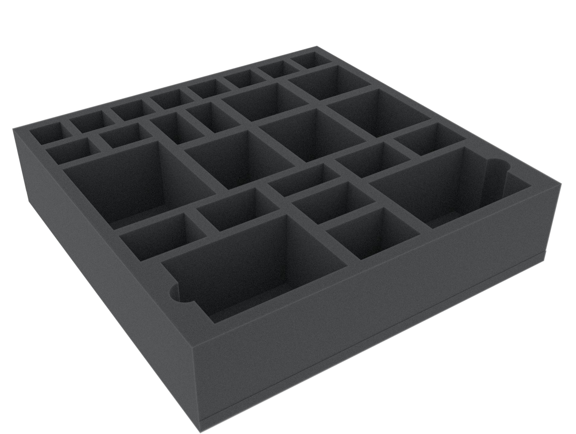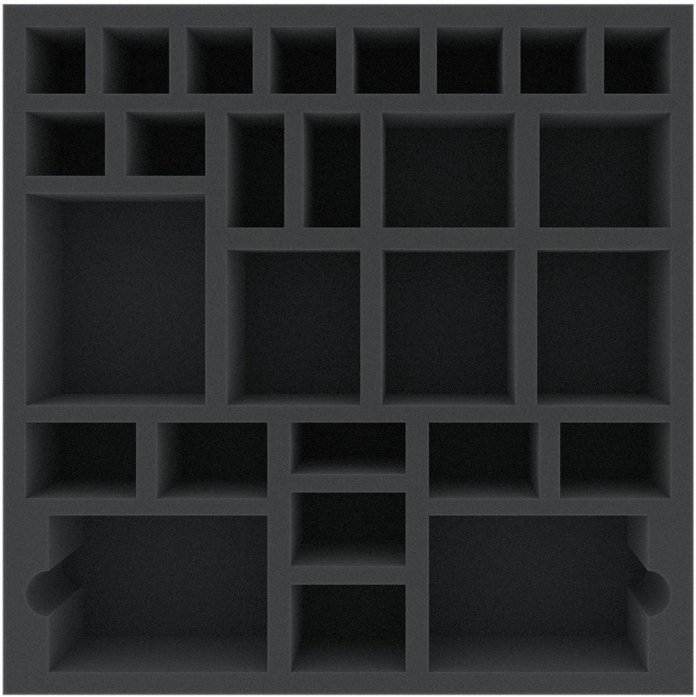 This foam tray is divided into 27 compartments of different sizes. It is particularly suitable for the safe storage of miniatures of various board games. The insert can also be used for sorting accessories like tokens. 2 compartments can be used as card compartments (ideal for standard size, 63 x 88 mm, with sleeve).