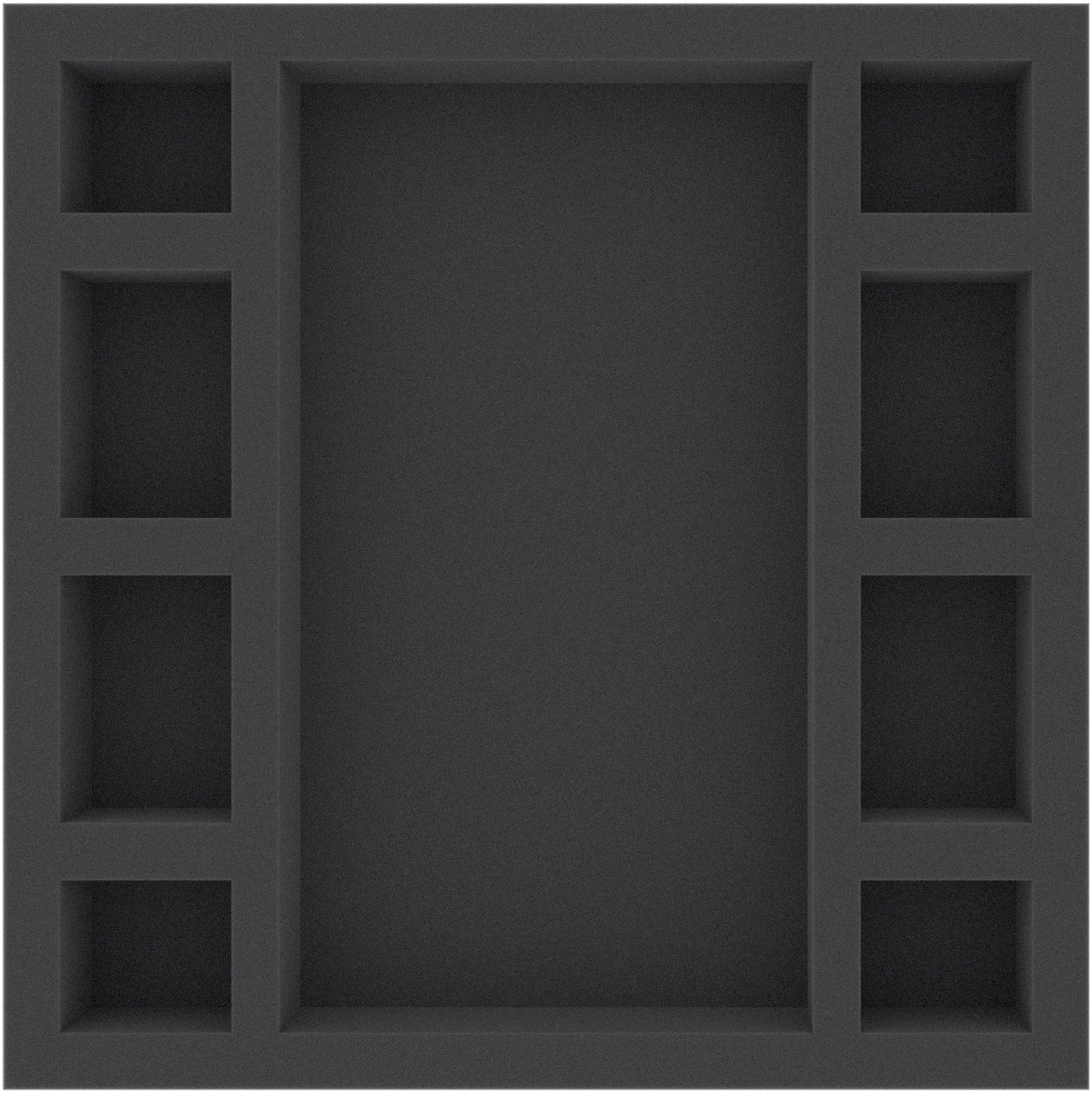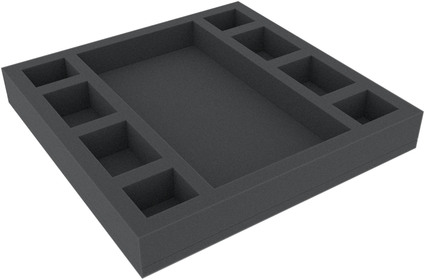 This foam insert is divided into 9 compartments of different sizes. It is ideal for safe storage of miniatures from various board games. But also game material such as dice and tokens can be stored neatly here. A large compartment in the middle is ideal for larger cardboard pieces, like tiles and dashboards.
