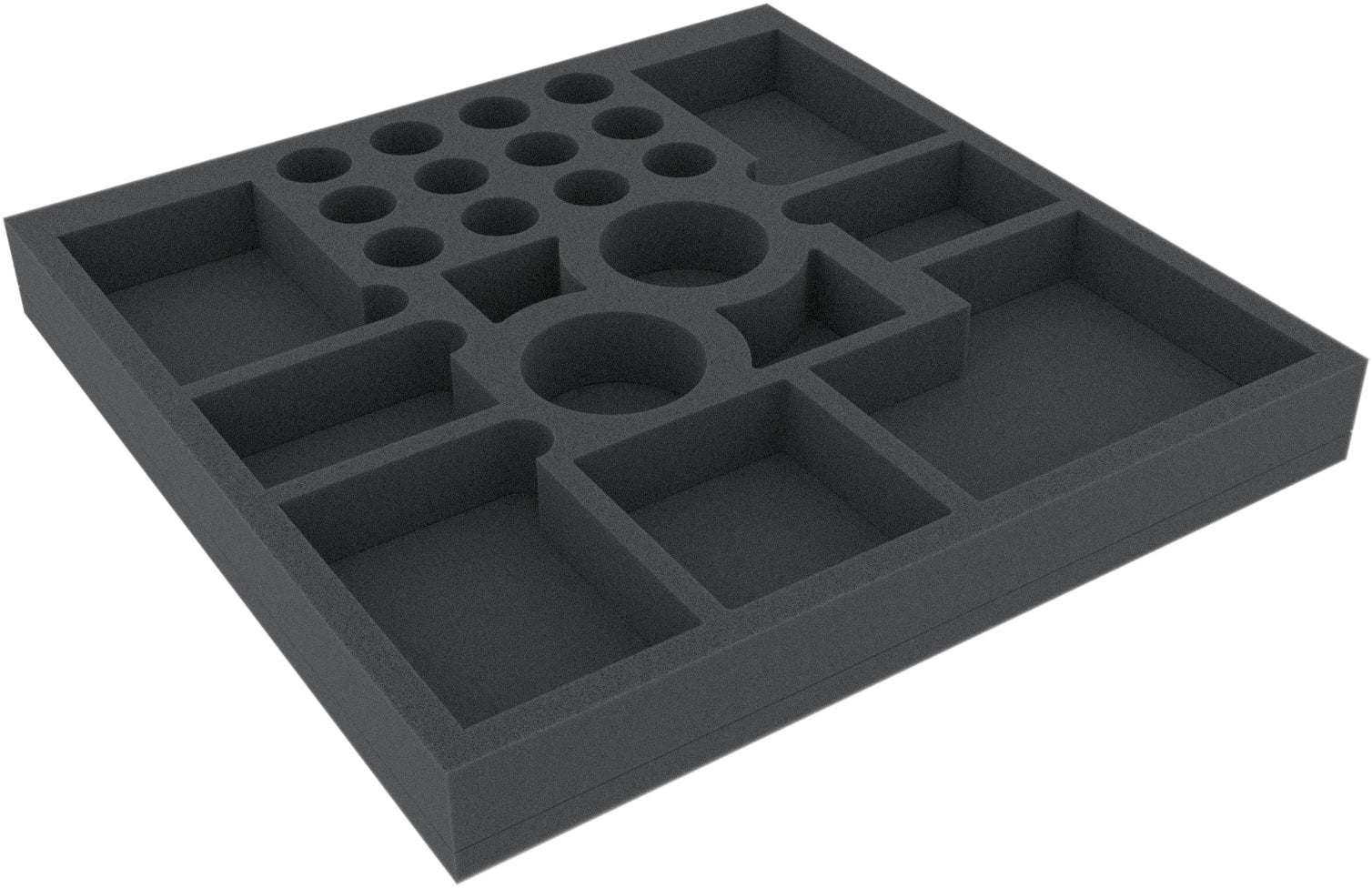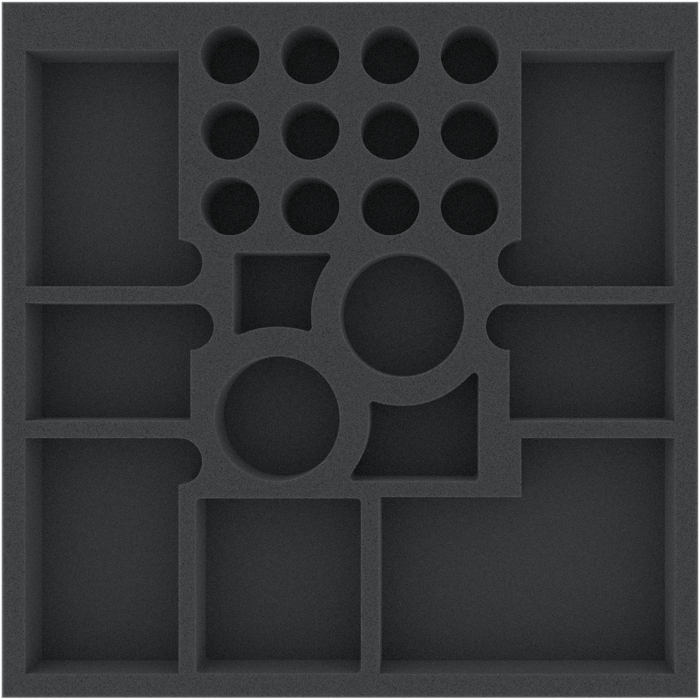 This foam tray has 23 compartments for the safe and orderly storage of board game material like e. g. tokens, cards and small miniatures. The fine-pored foam provides reliable protection against damage.