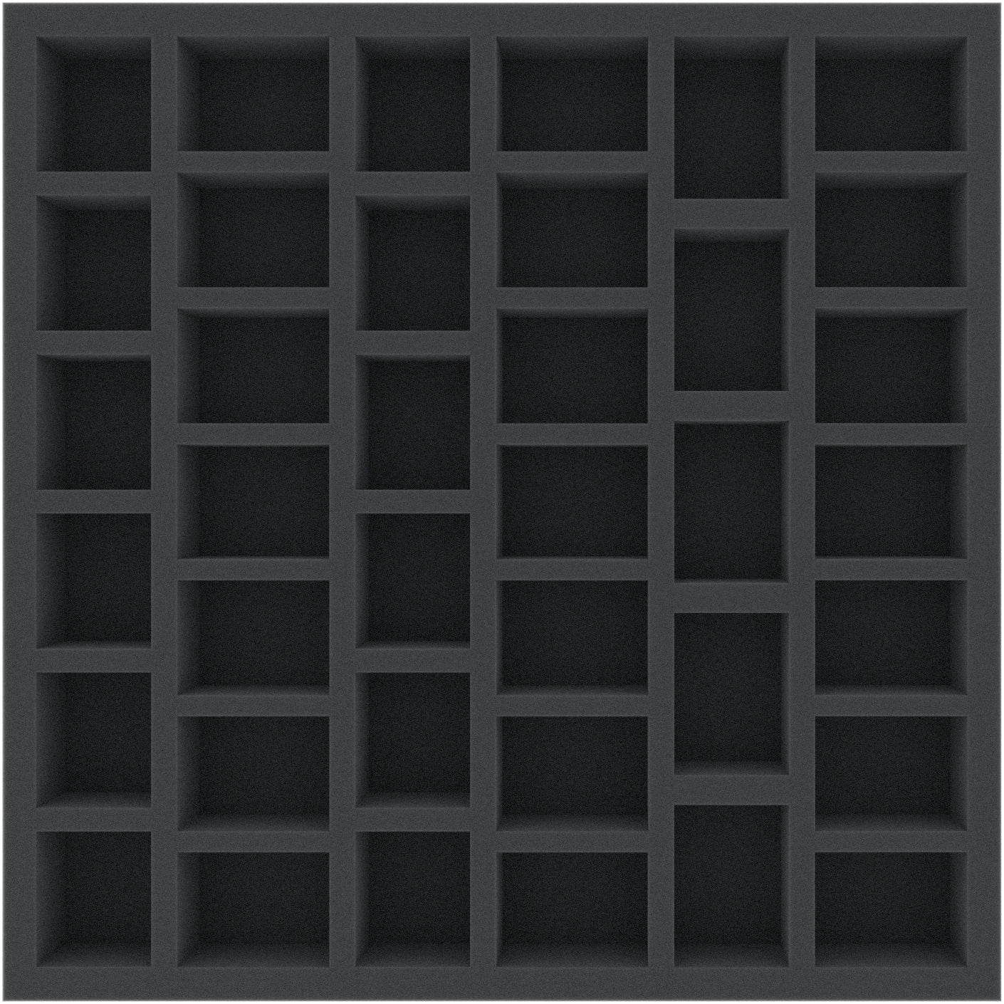 This foam tray is divided into 38 compartments of different sizes. It is particularly suitable as an insert for the safe storage of miniatures and game material in the original board game boxes (e.g. from CMON).